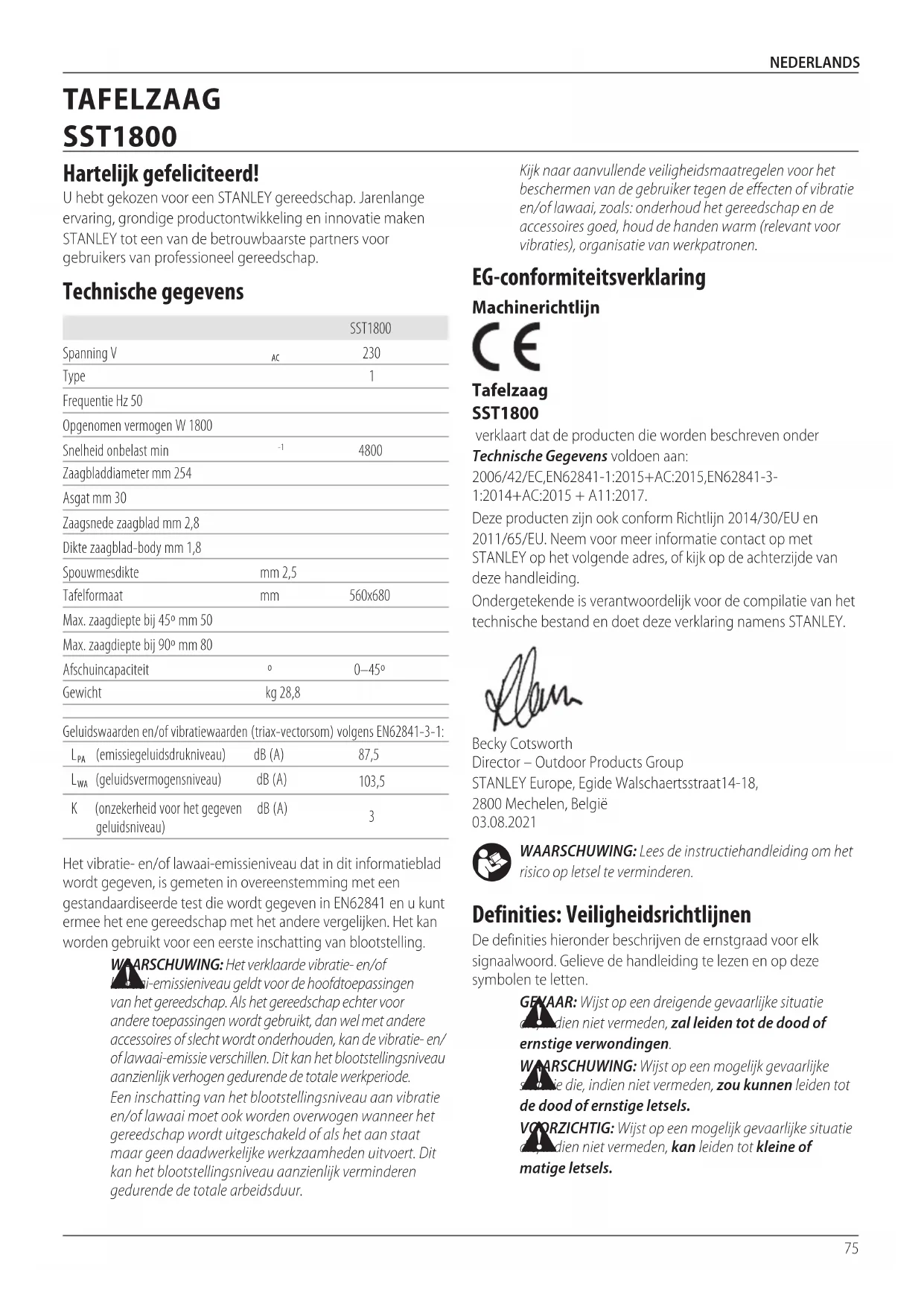e l'inserto del piano devono essere sistemati in posizione prima di utilizzare lasega. Prima dell'uso, esaminare attentamente le protezioni superiore e inferiore della lama e il tubo di aspirazione delle polveri, per verificarne il corretto funzionamento. Assicurarsi che i trucioli, la polvere o le particelle del pezzo non provochino il blocco di una dellefunzioni. In caso di frammenti del pezzo incastrati tra la lama e le protezioni, scollegare la macchina dall'alimentazione e seguire le istruzioni riportate ai capitoli Assemblaggio/Sostituzione della lama. Rimuovere le parti incastrate e riassemblare la lama dellasega. Tenere libere le feritoie di ventilazione e pulire l’esterno dell'elettroutensile periodicamente con un pannomorbido. Pulire regolarmente il sistema di aspirazione dellapolvere.75 NEDERLANDS WAARSCHUWING: Lees de instructiehandleiding om het risico op letsel teverminderen. Definities: Veiligheidsrichtlijnen De definities hieronder beschrijven de ernstgraad voor elk signaalwoord. Gelieve de handleiding te lezen en op deze symbolen teletten. GEVAAR: Wijst op een dreigende gevaarlijke situatie die, indien niet vermeden, zal leiden tot de dood of ernstigeverwondingen. WAARSCHUWING: Wijst op een mogelijk gevaarlijke situatie die, indien niet vermeden, zou kunnen leiden tot de dood of ernstigeletsels. VOORZICHTIG: Wijst op een mogelijk gevaarlijke situatie die, indien niet vermeden, kan leiden tot kleine of matigeletsels. EG‑conformiteitsverklaring Machinerichtlijn Tafelzaag SST1800 verklaart dat de producten die worden beschreven onder Technische Gegevens voldoen aan: 2006/42/EC, EN62841‑1:2015+AC:2015, EN62841‑3‑1:2014+AC:2015 + A11:2017.Deze producten zijn ook conform Richtlijn 2014/30/EU en 2011/65/EU. Neem voor meer informatie contact op met STANLEY op het volgende adres, of kijk op de achterzijde van dezehandleiding.Ondergetekende is verantwoordelijk voor de compilatie van het technische bestand en doet deze verklaring namensSTANLEY.Becky Cotsworth Director – Outdoor Products Group STANLEY Europe, Egide Walschaertsstraat14‑18, 2800Mechelen, België 03.08.2021Kijk naar aanvullende veiligheidsmaatregelen voor het beschermen van de gebruiker tegen de effecten of vibratie en/of lawaai, zoals: onderhoud het gereedschap en de accessoires goed, houd de handen warm (relevant voor vibraties), organisatie vanwerkpatronen.Het vibratie‑ en/of lawaai‑emissieniveau dat in dit informatieblad wordt gegeven, is gemeten in overeenstemming met een gestandaardiseerde test die wordt gegeven in EN62841 en u kunt ermee het ene gereedschap met het andere vergelijken. Het kan worden gebruikt voor een eerste inschatting vanblootstelling. WAARSCHUWING: Het verklaarde vibratie- en/of lawaai-emissieniveau geldt voor de hoofdtoepassingen van het gereedschap. Als het gereedschap echter voor andere toepassingen wordt gebruikt, dan wel met andere accessoires of slecht wordt onderhouden, kan de vibratie- en/of lawaai-emissie verschillen. Dit kan het blootstellingsniveau aanzienlijk verhogen gedurende de totalewerkperiode.Een inschatting van het blootstellingsniveau aan vibratie en/of lawaai moet ook worden overwogen wanneer het gereedschap wordt uitgeschakeld of als het aan staat maar geen daadwerkelijke werkzaamheden uitvoert. Dit kan het blootstellingsniveau aanzienlijk verminderen gedurende de totalearbeidsduur.SST1800Spanning V