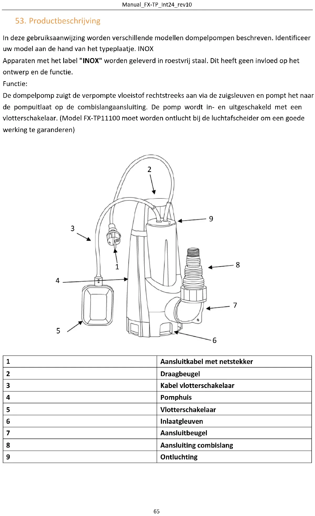 In deze gebruiksaanwijzing worden verschillende modellen dompelpompen beschreven. Identificeer uw model aan de hand van het typeplaatje. INOX Apparaten met het label "INOX" worden geleverd in roestvrij staal. Dit heeft geen invloed op het ontwerp en de functie. Functie: De dompelpomp zuigt de verpompte vloeistof rechtstreeks aan via de zuigsleuven en pompt het naar de pompuitlaat op de combislangaansluiting. De pomp wordt in- en uitgeschakeld met een vlotterschakelaar. (Model FX-TP11100 moet worden ontlucht bij de luchtafscheider om een goede werking te garanderen)