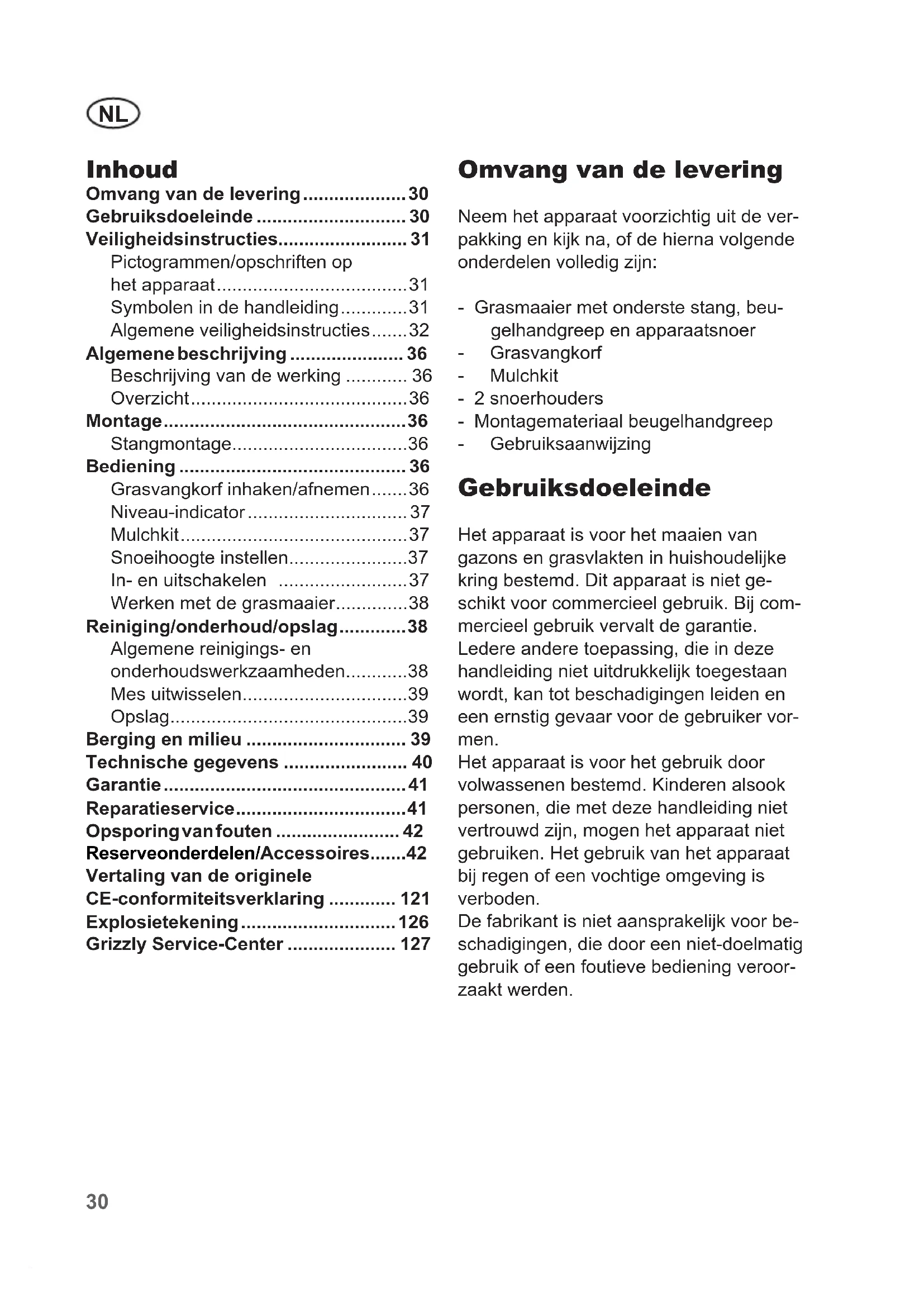 - Omvang van de levering Neem het apparaat voorzichtig uit de ver- pakking en kijk na, of de hierna volgende onderdelen volledig zijn: - Grasmaaier met onderste stang, beu- gelhandgreep en apparaatsnoer - Grasvangkorf - Mulchkit - 2 snoerhouders - Montagemateriaal beugelhandgreep - Gebruiksaanwijzing Gebruiksdoeleinde Het apparaat is voor het maaien van gazons en grasvlakten in huishoudelijke kring bestemd. Dit apparaat is niet ge- schikt voor commercieel gebruik. Bij com- mercieel gebruik vervalt de garantie. Ledere andere toepassing, die in deze handleiding niet uitdrukkelijk toegestaan wordt, kan tot beschadigingen leiden en een ernstig gevaar voor de gebruiker vor- men. Het apparaat is voor het gebruik door volwassenen bestemd. Kinderen alsook personen, die met deze handleiding niet vertrouwd zijn, mogen het apparaat niet gebruiken. Het gebruik van het apparaat bij regen of een vochtige omgeving is verboden. De fabrikant is niet aansprakelijk voor be- schadigingen, die door een niet-doelmatig gebruik of een foutieve bediening veroor- zaakt werden. Vertaling van de originele CE-conformiteitsverklaring p. 121