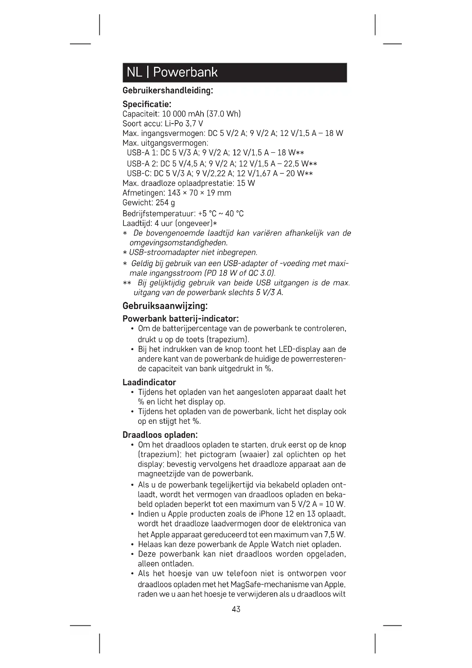 - Geldig bij gebruik van een USB-adapter of -voeding met maxi- male ingangsstroom (PD 18 W of QC 3.0). ** Bij gelijktijdig gebruik van beide USB uitgangen is de max. uitgang van de powerbank slechts 5 V/3 A. Gebruiksaanwijzing: Powerbank batterij-indicator: