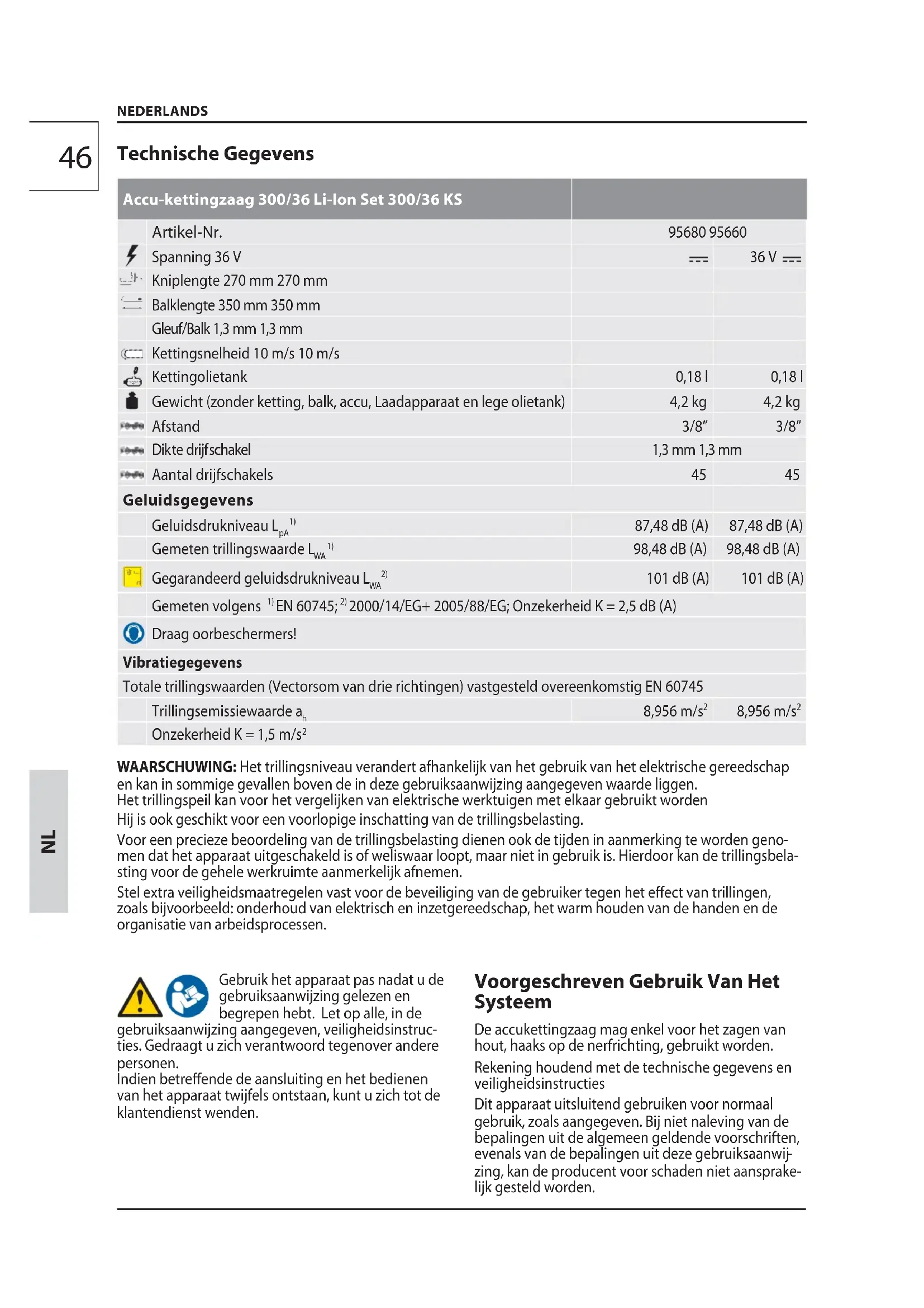 Spanning 36 V 36 V Kniplengte 270 mm 270 mm Balklengte 350 mm 350 mm Gleuf/Balk 1,3 mm 1,3 mm Kettingsnelheid 10 m/s 10 m/s Kettingolietank 0,18 l 0,18 l Gewicht (zonder ketting, balk, accu, Laadapparaat en lege olietank) 4,2 kg 4,2 kg Afstand 3/8” 3/8” Dikte drijfschakel 1,3 mm 1,3 mm Aantal drijfschakels 45 45 Geluidsgegevens Geluidsdrukniveau L