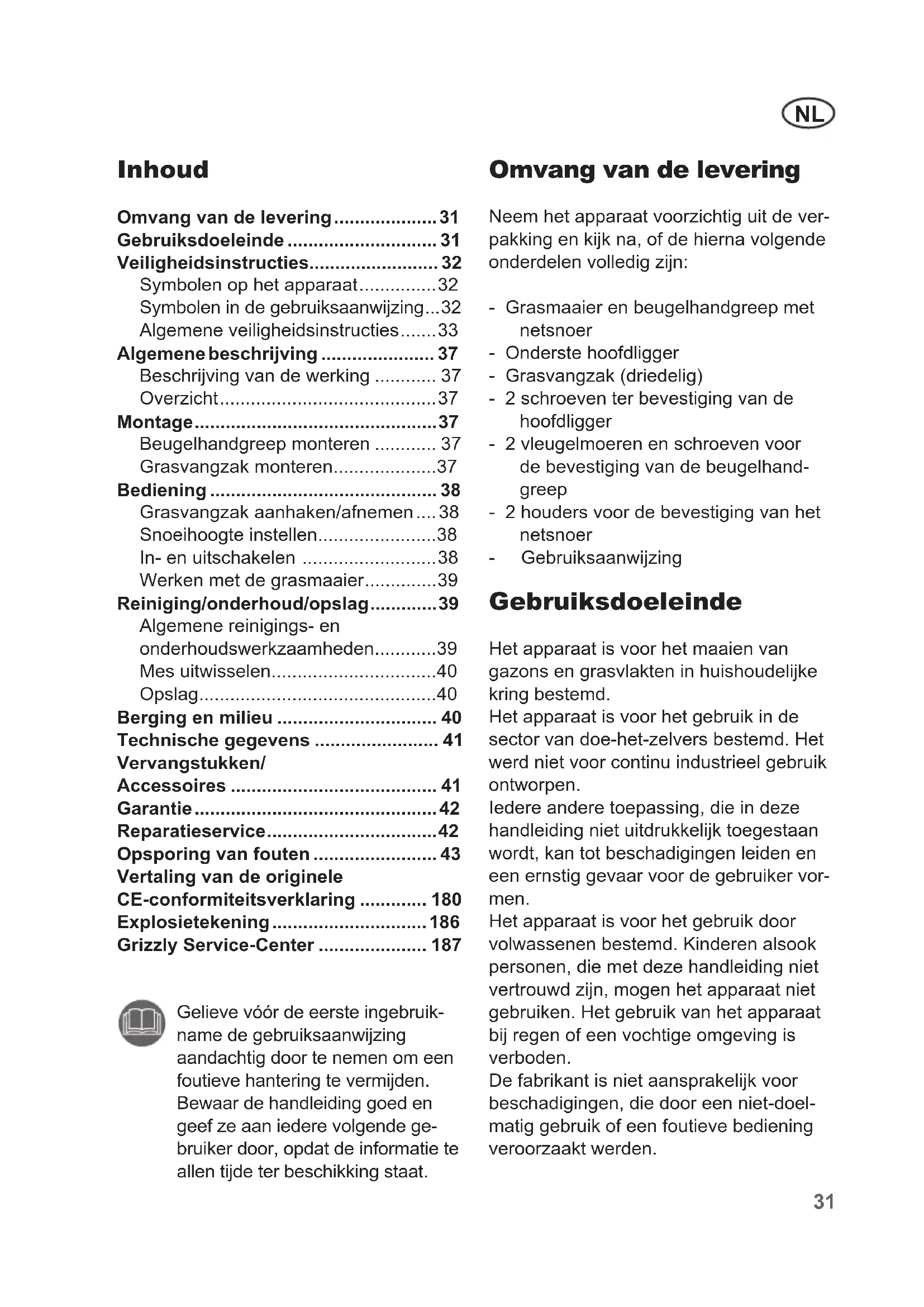 - Grizzly Service-Center Omvang van de levering Neem het apparaat voorzichtig uit de ver- pakking en kijk na, of de hierna volgende onderdelen volledig zijn: - Grasmaaier en beugelhandgreep met netsnoer - Onderste hoofdligger - Grasvangzak (driedelig) - 2 schroeven ter bevestiging van de hoofdligger - 2 vleugelmoeren en schroeven voor de bevestiging van de beugelhand- greep - 2 houders voor de bevestiging van het netsnoer - Gebruiksaanwijzing Gebruiksdoeleinde Het apparaat is voor het maaien van gazons en grasvlakten in huishoudelijke kring bestemd. Het apparaat is voor het gebruik in de sector van doe-het-zelvers bestemd. Het werd niet voor continu industrieel gebruik ontworpen. Iedere andere toepassing, die in deze handleiding niet uitdrukkelijk toegestaan wordt, kan tot beschadigingen leiden en een ernstig gevaar voor de gebruiker vor- men. Het apparaat is voor het gebruik door volwassenen bestemd. Kinderen alsook personen, die met deze handleiding niet vertrouwd zijn, mogen het apparaat niet gebruiken. Het gebruik van het apparaat bij regen of een vochtige omgeving is verboden. De fabrikant is niet aansprakelijk voor beschadigingen, die door een niet-doel- matig gebruik of een foutieve bediening veroorzaakt werden.NL p. 187