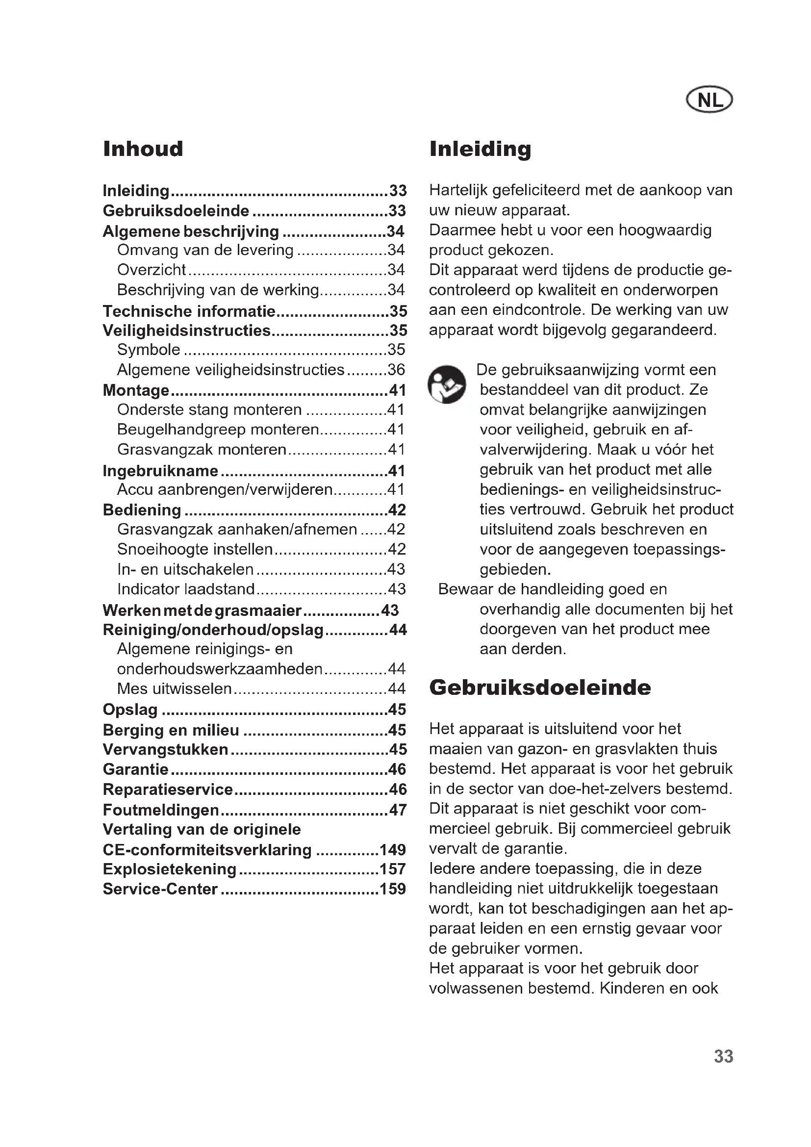 - Inleiding Hartelijk gefeliciteerd met de aankoop van uw nieuw apparaat. Daarmee hebt u voor een hoogwaardig product gekozen. Dit apparaat werd tijdens de productie ge- controleerd op kwaliteit en onderworpen aan een eindcontrole. De werking van uw apparaat wordt bijgevolg gegarandeerd. De gebruiksaanwijzing vormt een bestanddeel van dit product. Ze omvat belangrijke aanwijzingen voor veiligheid, gebruik en af- valverwijdering. Maak u vóór het gebruik van het product met alle bedienings- en veiligheidsinstruc- ties vertrouwd. Gebruik het product uitsluitend zoals beschreven en voor de aangegeven toepassings- gebieden. Bewaar de handleiding goed en overhandig alle documenten bij het doorgeven van het product mee aan derden. Gebruiksdoeleinde Het apparaat is uitsluitend voor het maaien van gazon- en grasvlakten thuis bestemd. Het apparaat is voor het gebruik in de sector van doe-het-zelvers bestemd. Dit apparaat is niet geschikt voor com- mercieel gebruik. Bij commercieel gebruik vervalt de garantie. Iedere andere toepassing, die in deze handleiding niet uitdrukkelijk toegestaan wordt, kan tot beschadigingen aan het ap- paraat leiden en een ernstig gevaar voor de gebruiker vormen. Het apparaat is voor het gebruik door volwassenen bestemd. Kinderen en ook Vertaling van de originele CE-conformiteitsverklaring p. 149