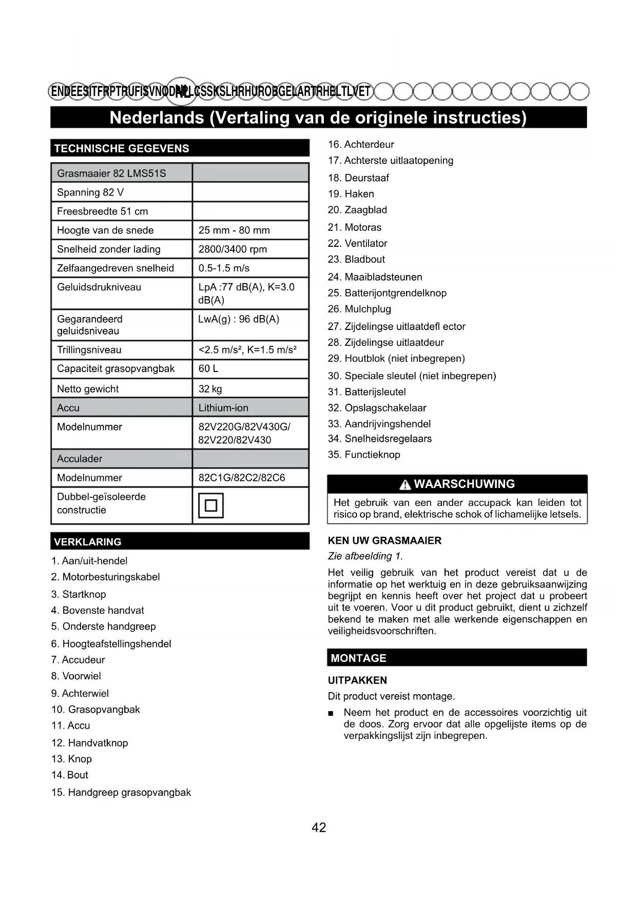 Bout 15. Handgreep grasopvangbak16. Achterdeur17. Achterste uitlaatopening18. Deurstaaf19. Haken20. Zaagblad21. Motoras22. Ventilator23. Bladbout24. Maaibladsteunen25. Batterijontgrendelknop 26. Mulchplug27. Zijdelingse uitlaatdefl ector28. Zijdelingse uitlaatdeur29. Houtblok (niet inbegrepen)30. Speciale sleutel (niet inbegrepen)31. Batterijsleutel 32. Opslagschakelaar33. Aandrijvingshendel 34. Snelheidsregelaars35. Functieknop WAARSCHUWING Het gebruik van een ander accupack kan leiden tot risico op brand, elektrische schok of lichamelijke letsels. KEN UW GRASMAAIERZie afbeelding 1.Het veilig gebruik van het product vereist dat u de informatie op het werktuig en in deze gebruiksaanwijzing begrijpt en kennis heeft over het project dat u probeert uit te voeren. Voor u dit product gebruikt, dient u zichzelf bekend te maken met alle werkende eigenschappen en veiligheidsvoorschriften.MONTAGEUITPAKKENDit product vereist montage. ■ Neem het product en de accessoires voorzichtig uit de doos. Zorg ervoor dat alle opgelijste items op de verpakkingslijst zijn inbegrepen. 42Nederlands (Vertaling van de originele instructies)