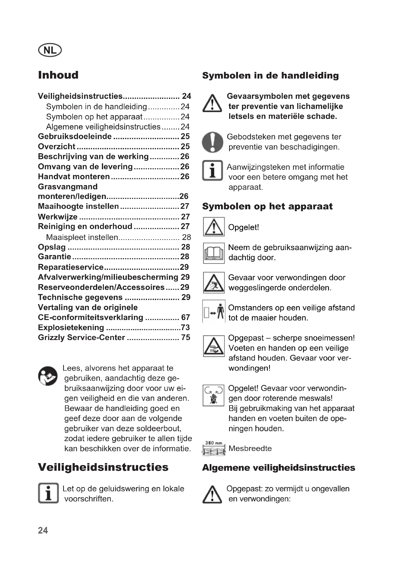 - Symbolen in de handleiding Gevaarsymbolen met gegevens ter preventie van lichamelijke letsels en materiële schade. Gebodsteken met gegevens ter preventie van beschadigingen. Aanwijzingsteken met informatie voor een betere omgang met het apparaat. Symbolen op het apparaat Opgelet! Neem de gebruiksaanwijzing aan- dachtig door. Gevaar voor verwondingen door weggeslingerde onderdelen. Omstanders op een veilige afstand tot de maaier houden. Opgepast – scherpe snoeimessen! Voeten en handen op een veilige afstand houden. Gevaar voor ver- wondingen! Opgelet! Gevaar voor verwondin- gen door roterende meswals! Bij gebruikmaking van het apparaat handen en voeten buiten de ope- ningen houden. Mesbreedte Algemene veiligheidsinstructies Opgepast: zo vermijdt u ongevallen en verwondingen: Inhoud Veiligheidsinstructies p. 24