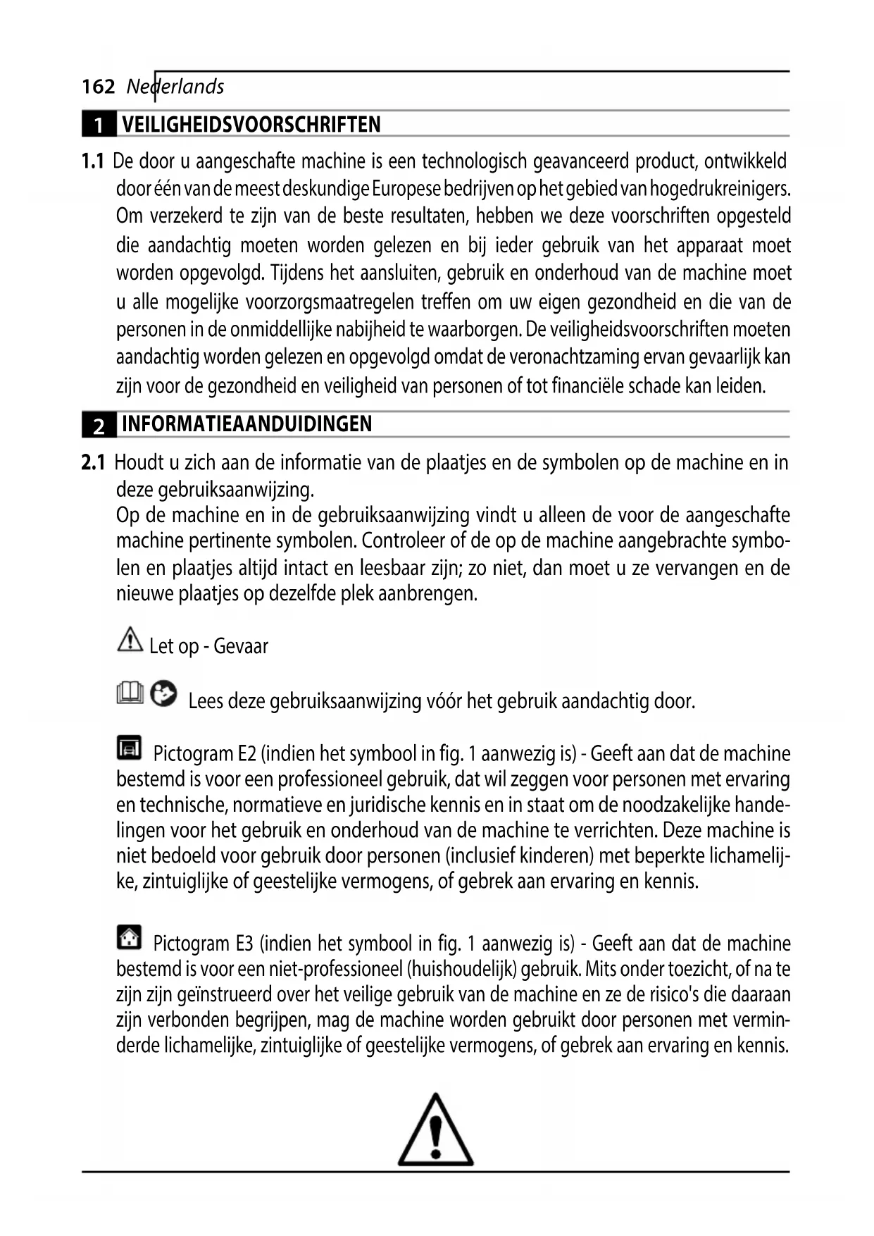 len en plaatjes altijd intact en leesbaar zijn; zo niet, dan moet u ze vervangen en de nieuwe plaatjes op dezelfde plek aanbrengen. Let op - Gevaar Lees deze gebruiksaanwijzing vóór het gebruik aandachtig door. Pictogram E2 (indien het symbool in fig. 1 aanwezig is) - Geeft aan dat de machine bestemd is voor een professioneel gebruik, dat wil zeggen voor personen met ervaring en technische, normatieve en juridische kennis en in staat om de noodzakelijke hande