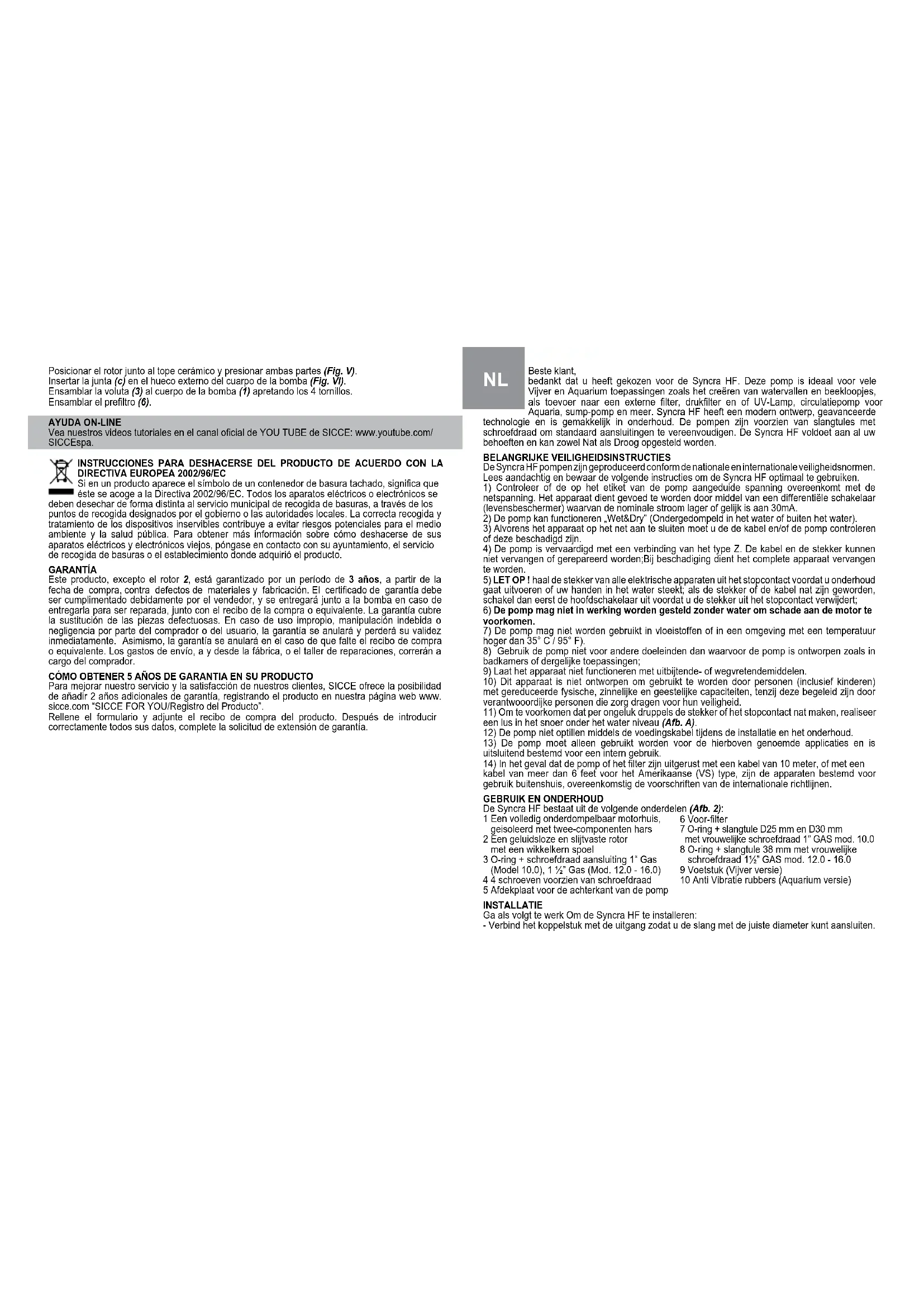 De Syncra HF bestaat uit de volgende onderdelen (Afb. 2): 1 Een volledig onderdompelbaar motorhuis, geisoleerd met twee-componenten hars 2 Een geluidsloze en slijtvaste rotor met een wikkelkern spoel 3 O-ring + schroefdraad aansluiting 1“ Gas (Model 10.0), 1 ½” Gas (Mod. 12.0 - 16.0) 4 4 schroeven voorzien van schroefdraad 5 Afdekplaat voor de achterkant van de pomp INSTALLATIE Ga als volgt te werk Om de Syncra HF te installeren: - Verbind het koppelstuk met de uitgang zodat u de slang met de juiste diameter kunt aansluiten. 6 Voor-lter 7 O-ring + slangtule D25 mm en D30 mm met vrouwelijke schroefdraad 1” GAS mod. 10.0 8 O-ring + slangtule 38 mm met vrouwelijke schroefdraad 1½” GAS mod. 12.0 - 16.0 9 Voetstuk (Vijver versie) 10 Anti Vibratie rubbers (Aquarium versie)u enigszins de grip verliest dat de as van de rotor de onderste lager doet beschadigen. Een beschadiging aan de as of de lager veroorzaakt hoge reparatie kosten. SPECIAAL ONDERHOUD EN HET VERVANGEN VAN DE ROTOR Verwijder de volledige rotor (2 - Afb.I) uit het pomphuis ‘. Plaats de haak in het rotorhuis (Afb. II), en haak in de keramische lager die aan het einde van het huis aanweizg is (Afb. III) daarna kunt u deze met een beetje kracht los trekken. Spoel met schoon water en azijn het interne pomphuis schoon en positie de nieuwe keramische lager aan het begin van het rotorhuis (Afb. IV). Plaats de O-ring (a) in het pomphuis (1). Plaats de O-ring (b) in de behuizing van de schijf met gaten van de rotor (2). Plaats de rotor nabij de keramische lager en druk beide het rotorhuis binnen (Afb. V) tot ze de correcte positie bereikt hebben. Plaats de O-ring (c) aan de buitenkant van de pomp (Afb. VI). Monteer het slakkenhuis (3) in de pomp (1) door het op z’n plaats te duwen en draai de 4 schroeven vast . Monteer het voor-lter (6). ONLINE HULP Bekijk onze instructievideo’s op het ofciële SICCE YOU TUBE kanaal www.youtube.com/ SICCEspa. AANWIJZINGEN VOOR EEN JUISTE AFVOER VAN HET PRODUCT VOLGENS DE