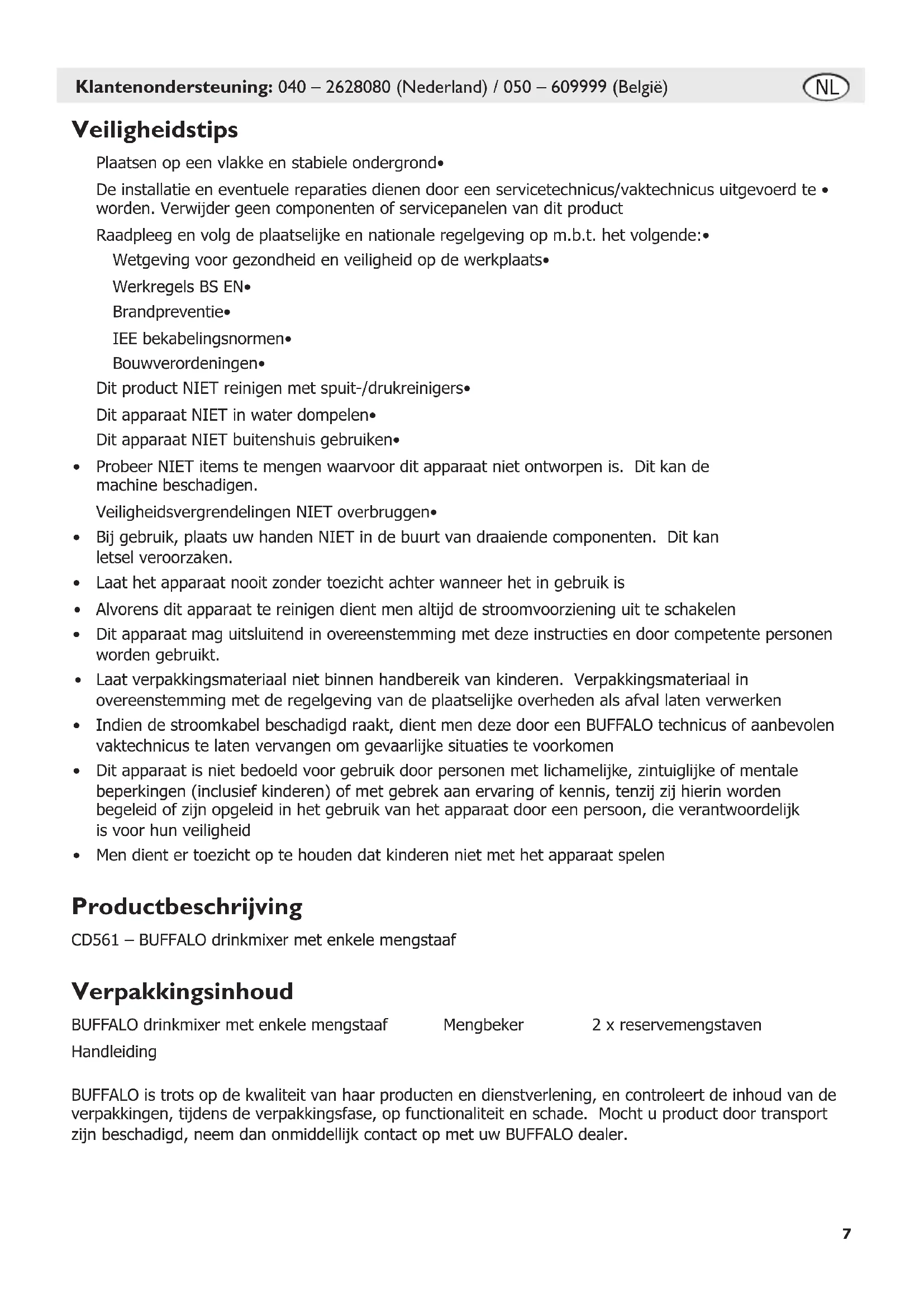 Veiligheidstips Plaatsen op een vlakke en stabiele ondergrond• De installatie en eventuele reparaties dienen door een servicetechnicus/vaktechnicus uitgevoerd te • worden. Verwijder geen componenten of servicepanelen van dit product Raadpleeg en volg de plaatselijke en nationale regelgeving op m.b.t. het volgende:• Wetgeving voor gezondheid en veiligheid op de werkplaats• Werkregels BS EN• Brandpreventie• IEE bekabelingsnormen• Bouwverordeningen• Dit product NIET reinigen met spuit-/drukreinigers• Dit apparaat NIET in water dompelen• Dit apparaat NIET buitenshuis gebruiken• Probeer NIET items te mengen waarvoor dit apparaat niet ontworpen is. Dit kan de • machine beschadigen. Veiligheidsvergrendelingen NIET overbruggen• Bij gebruik, plaats uw handen NIET in de buurt van draaiende componenten. Dit kan • letsel veroorzaken. Laat het apparaat nooit zonder toezicht achter wanneer het in gebruik is• Alvorens dit apparaat te reinigen dient men altijd de stroomvoorziening uit te schakelen• Dit apparaat mag uitsluitend in overeenstemming met deze instructies en door competente personen • worden gebruikt. Laat verpakkingsmateriaal niet binnen handbereik van kinderen. Verpakkingsmateriaal in • overeenstemming met de regelgeving van de plaatselijke overheden als afval laten verwerken Indien de stroomkabel beschadigd raakt, dient men deze door een BUFFALO technicus of aanbevolen • vaktechnicus te laten vervangen om gevaarlijke situaties te voorkomen Dit apparaat is niet bedoeld voor gebruik door personen met lichamelijke, zintuiglijke of mentale • beperkingen (inclusief kinderen) of met gebrek aan ervaring of kennis, tenzij zij hierin worden begeleid of zijn opgeleid in het gebruik van het apparaat door een persoon, die verantwoordelijk is voor hun veiligheid Men dient er toezicht op te houden dat kinderen niet met het apparaat spelen• Productbeschrijving CD561 – BUFFALO drinkmixer met enkele mengstaaf Verpakkingsinhoud BUFFALO drinkmixer met enkele mengstaaf Mengbeker 2 x reservemengstaven Handleiding BUFFALO is trots op de kwaliteit van haar producten en dienstverlening, en controleert de inhoud van de verpakkingen, tijdens de verpakkingsfase, op functionaliteit en schade. Mocht u product door transport zijn beschadigd, neem dan onmiddellijk contact op met uw BUFFALO dealer.NL
