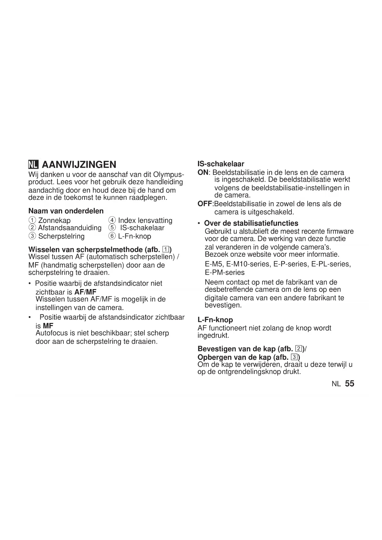 - Over de stabilisatiefuncties Gebruikt u alstublieft de meest recente firmware voor de camera. De werking van deze functie zal veranderen in de volgende camera’s. Bezoek onze website voor meer informatie. E-M5, E-M10-series, E-P-series, E-PL-series, E-PM-series Neem contact op met de fabrikant van de desbetreffende camera om de lens op een digitale camera van een andere fabrikant te bevestigen. L-Fn-knop AF functioneert niet zolang de knop wordt ingedrukt. Bevestigen van de kap (afb. 2)/ Opbergen van de kap (afb. 3) Om de kap te verwijderen, draait u deze terwijl u op de ontgrendelingsknop drukt. NL56 NL Opmerkingen over het fotograferen