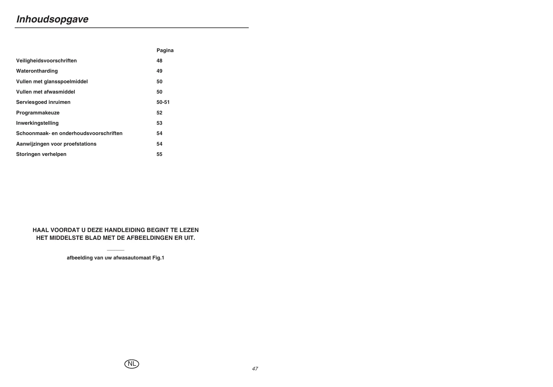 HAAL VOORDAT U DEZE HANDLEIDING BEGINT TE LEZEN HET MIDDELSTE BLAD MET DE AFBEELDINGEN ER UIT. afbeelding van uw afwasautomaat Fig.1