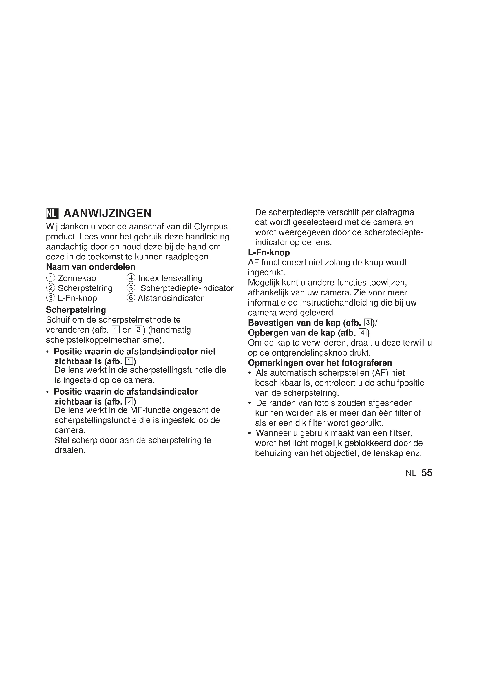 De software in deze lens kan software van derden bevatten. Software van derden is onderworpen aan door de eigenaars of licentiegevers van de betreffende software opgelegde bepalingen en voorwaarden, waaronder software aan u wordt geleverd. Deze voorwaarden en andere softwarebepalingen van derden kunnen, indien van toepassing, worden gevonden in de PDF met de softwareverklaring opgeslagen op http://www.olympus.co.jp/en/support/imsg/ digicamera/download/notice/notice.cfm58 NO INSTRUKSJONER Takk for at du valgte dette Olympus-produktet. For din egen sikkerhets skyld: Les denne bruksanvisningen før bruk og oppbevar den tilgjengelig for fremtidige oppslag. Navn på komponenter 1 Solblender 2 Fokusring 3 L-Fn-knapp 4 Fatningsindeks 5 Dybdeskarphetsindikator 6 Avstandsindikator Fokusring Skyv for å bytte fokuseringsmetode (fig. 1 og
