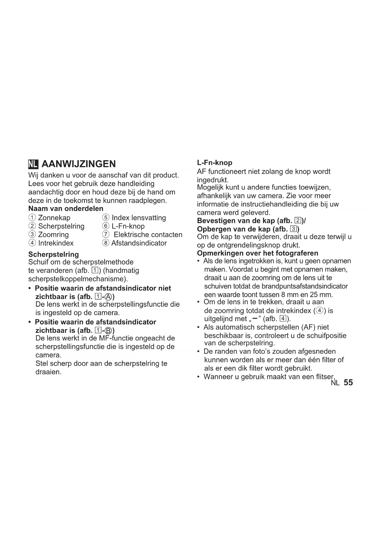 - Wanneer u gebruik maakt van een flitser, NL56 NL wordt het licht mogelijk geblokkeerd door de behuizing van het objectief, de lenskap enz.