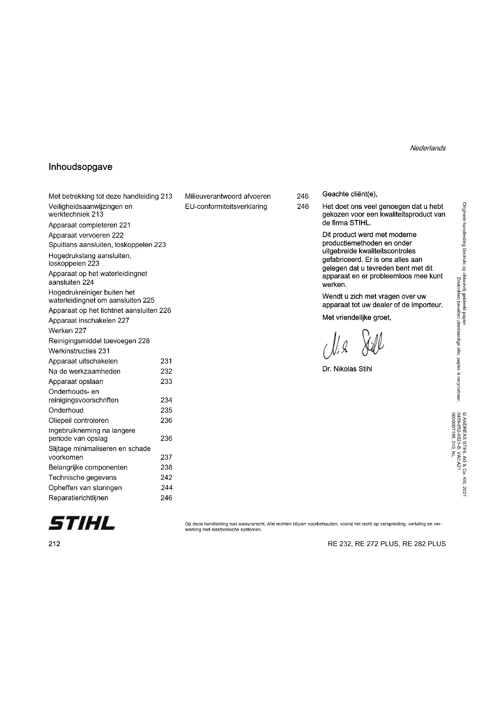 Op deze handleiding rust auteursrecht. Alle rechten blijven voorbehouden, vooral het recht op verspreiding, vertaling en ver- werking met elektronische systemen. Inhoudsopgave Geachte cliënt(e), Het doet ons veel genoegen dat u hebt gekozen voor een kwaliteitsproduct van de firma STIHL. Dit product werd met moderne productiemethoden en onder uitgebreide kwaliteitscontroles gefabriceerd. Er is ons alles aan gelegen dat u tevreden bent met dit apparaat en er probleemloos mee kunt werken. Wendt u zich met vragen over uw apparaat tot uw dealer of de importeur. Met vriendelijke groet, Dr. Nikolas Stihl Met betrekking tot deze handleiding 213 Veiligheidsaanwijzingen en werktechniek 213 Apparaat completeren 221 Apparaat vervoeren 222 Spuitlans aansluiten, loskoppelen 223 Hogedrukslang aansluiten, loskoppelen 223 Apparaat op het waterleidingnet aansluiten 224 Hogedrukreiniger buiten het waterleidingnet om aansluiten 225 Apparaat op het lichtnet aansluiten 226 Apparaat inschakelen 227 Werken 227 Reinigingsmiddel toevoegen 228 Werkinstructies 231 Apparaat uitschakelen 231 Na de werkzaamheden 232 Apparaat opslaan 233 Onderhouds- en reinigingsvoorschriften 234 Onderhoud 235 Oliepeil controleren 236 Ingebruikneming na langere periode van opslag 236 Slijtage minimaliseren en schade voorkomen 237 Belangrijke componenten 238 Technische gegevens 242 Opheffen van storingen 244 Reparatierichtlijnen 246 Milieuverantwoord afvoeren 246 EU-conformiteitsverklaring 246RE 232, RE 272 PLUS, RE 282 PLUS Nederlands