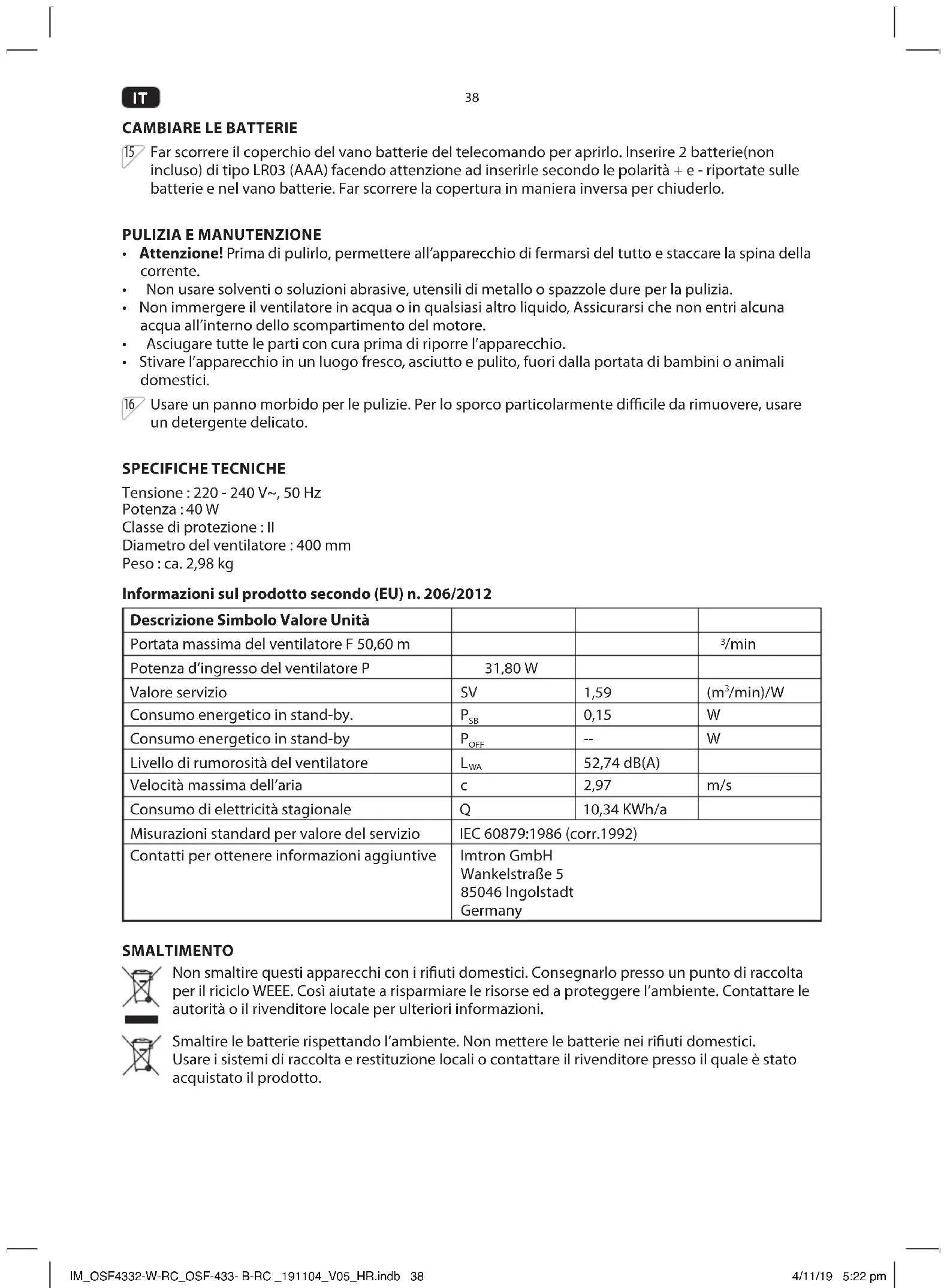 52,74 dB(A) Maximale luchtsnelheid c 2,97 m/s Seizoensgebonden elektriciteitsverbruik Q 10,34 KWh/a Meetstandaard voor de servicewaarde IEC 60879:1986 (corr.1992) Contactgegevens voor het verkrijgen van meer informatie Imtron GmbH Wankelstraße 5 85046 Ingolstadt Germany AFVAL Gooi dit apparaat niet weg bij het huisafval. Lever het in bij een inzamelpunt voor de recycling van elektrische en elektronische apparatuur. Op deze manier helpt u bronnen te sparen en het milieu te beschermen. Neem contact op met uw detailhandelaar of met de lokale autoriteiten voor meer informatie. Werp batterijen op een milieuvriendelijke manier weg. Gooi batterijen niet in de prullenbak. Gebruik alstublieft de retour- en inzamelingssystemen in uw gemeente of neem contact op met de leverancier waar u dit product heeft gekocht. IM_OSF4332-W-RC_OSF-433- B-RC _191104_V05_HR.indb 43 4/11/19 5:22 pm44