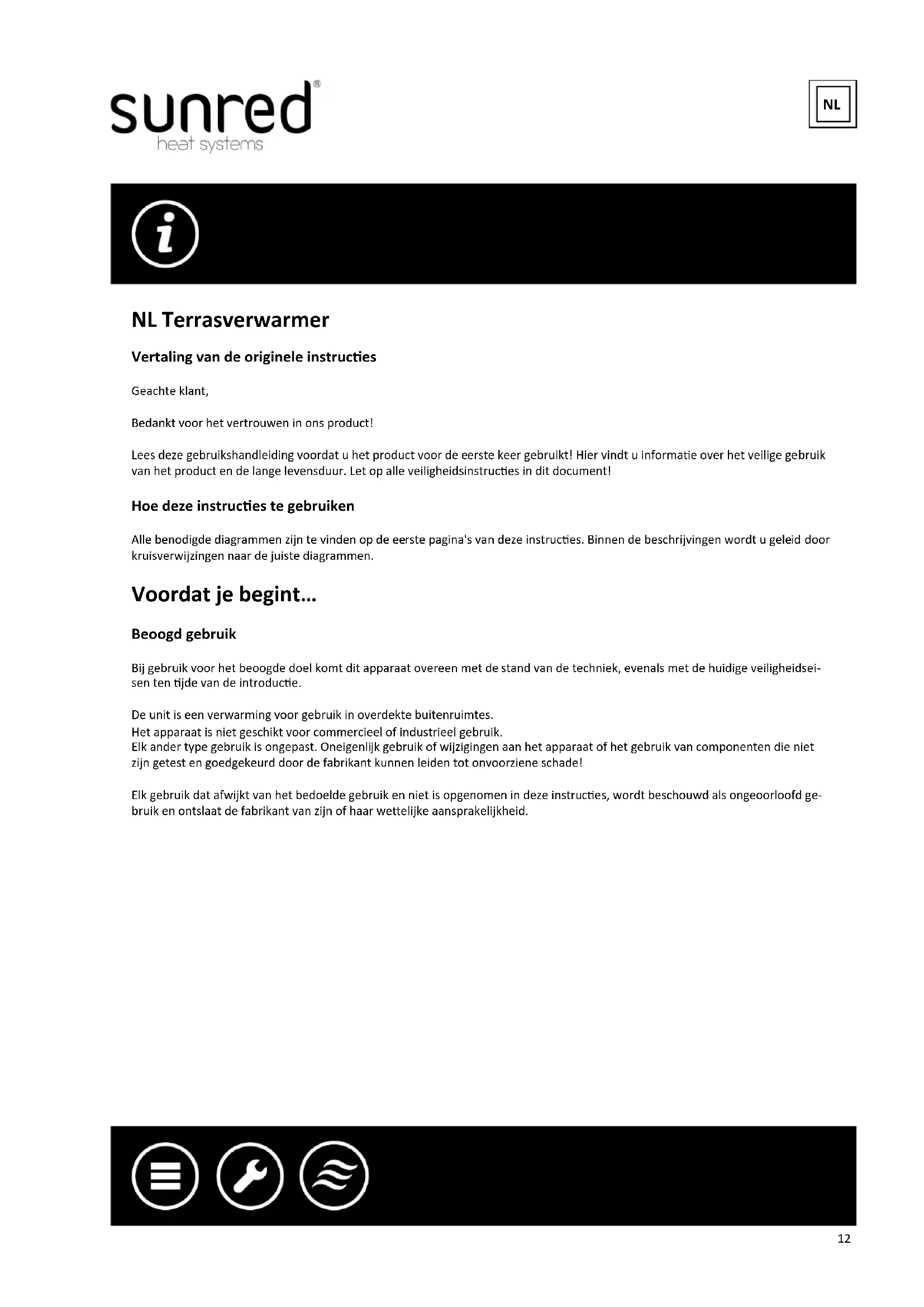 EN 55014-1:2017,EN 55014-2:2015 EN 61000-3-2:2014,EN 61000-3-3:2013 I hereby declare that the equipment named above has been designed to comply with the relevant secons of above referenced Standards and meets all essenal requirements of the speciced Direcves. Signed: R. Dijkman Signature: Posion: Managing Director Locaon: Nieuwleusen, The Netherlands Date of issue: Nieuwleusen, 13/12/201912 NL Terrasverwarmer Vertaling van de originele instruces Geachte klant, Bedankt voor het vertrouwen in ons product! Lees deze gebruikshandleiding voordat u het product voor de eerste keer gebruikt! Hier vindt u informae over het veilige gebruik van het product en de lange levensduur. Let op alle veiligheidsinstruces in dit document! Hoe deze instruces te gebruiken Alle benodigde diagrammen zijn te vinden op de eerste pagina's van deze instruces. Binnen de beschrijvingen wordt u geleid door kruisverwijzingen naar de juiste diagrammen. Voordat je begint… Beoogd gebruik Bij gebruik voor het beoogde doel komt dit apparaat overeen met de stand van de techniek, evenals met de huidige veiligheidsei- sen ten jde van de introduce. De unit is een verwarming voor gebruik in overdekte buitenruimtes. Het apparaat is niet geschikt voor commercieel of industrieel gebruik. Elk ander type gebruik is ongepast. Oneigenlijk gebruik of wijzigingen aan het apparaat of het gebruik van componenten die niet zijn getest en goedgekeurd door de fabrikant kunnen leiden tot onvoorziene schade! Elk gebruik dat afwijkt van het bedoelde gebruik en niet is opgenomen in deze instruces, wordt beschouwd als ongeoorloofd ge- bruik en ontslaat de fabrikant van zijn of haar weelijke aansprakelijkheid. NL13 Voor uw veiligheid Algemene veiligheidsinstruces
