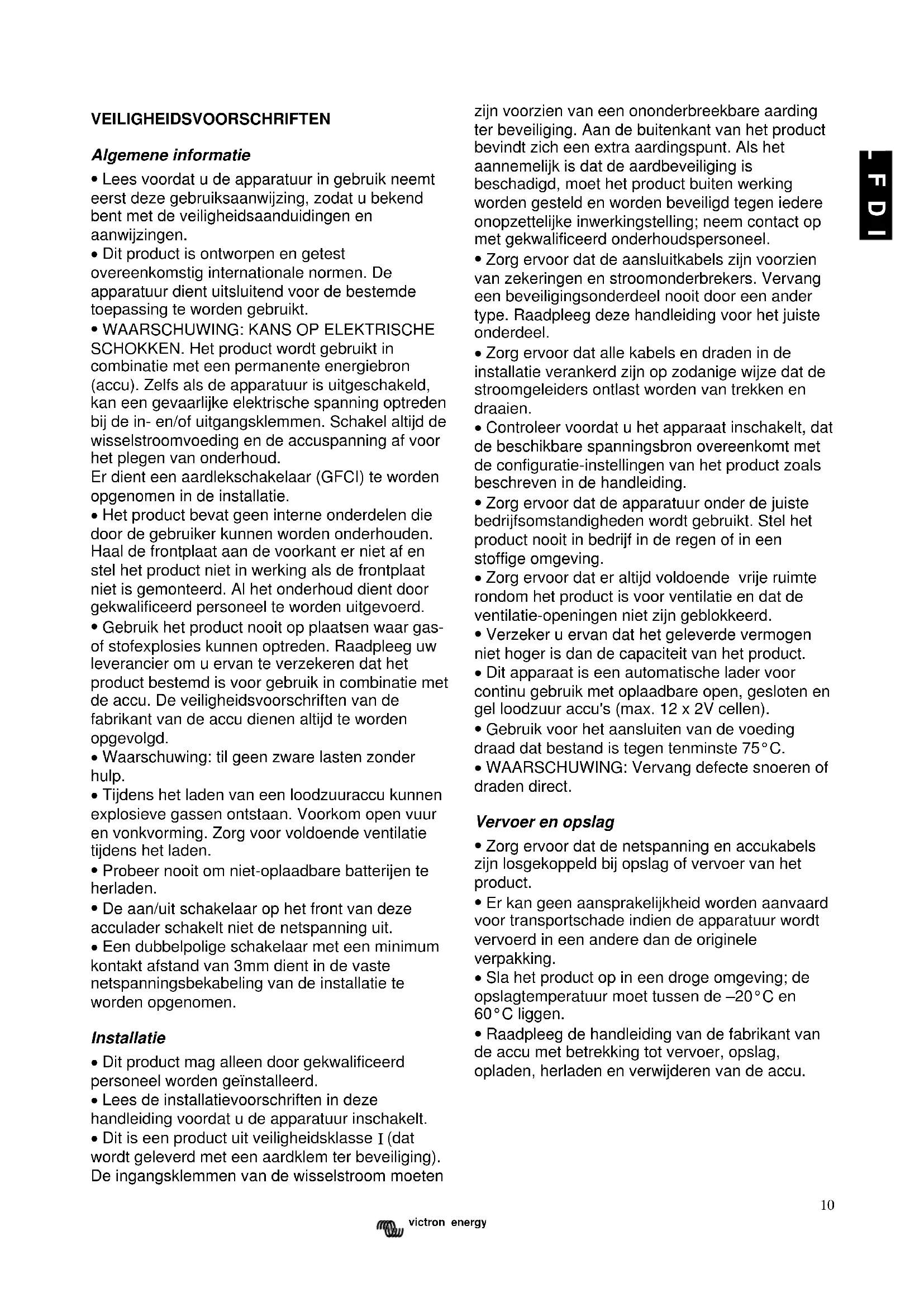 Raadpleeg de handleiding van de fabrikant van de accu met betrekking tot vervoer, opslag, opladen, herladen en verwijderen van de accu.11 victron energy