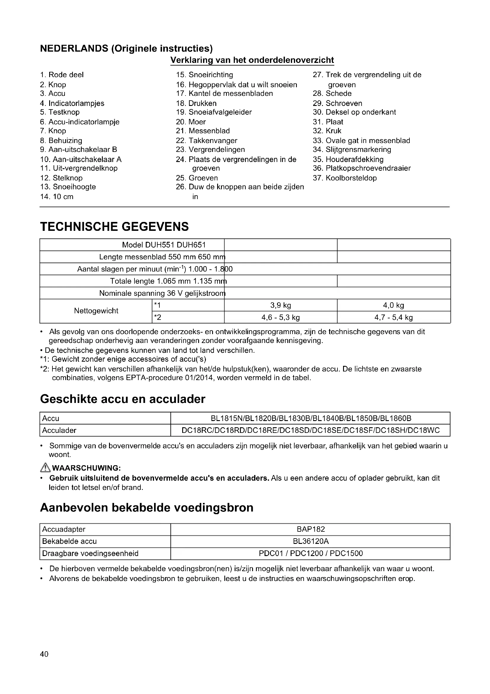 - De technische gegevens kunnen van land tot land verschillen. *1: Gewicht zonder enige accessoires of accu('s) *2: Het gewicht kan verschillen afhankelijk van het/de hulpstuk(ken), waaronder de accu. De lichtste en zwaarste combinaties, volgens EPTA-procedure 01/2014, worden vermeld in de tabel. Geschikte accu en acculader