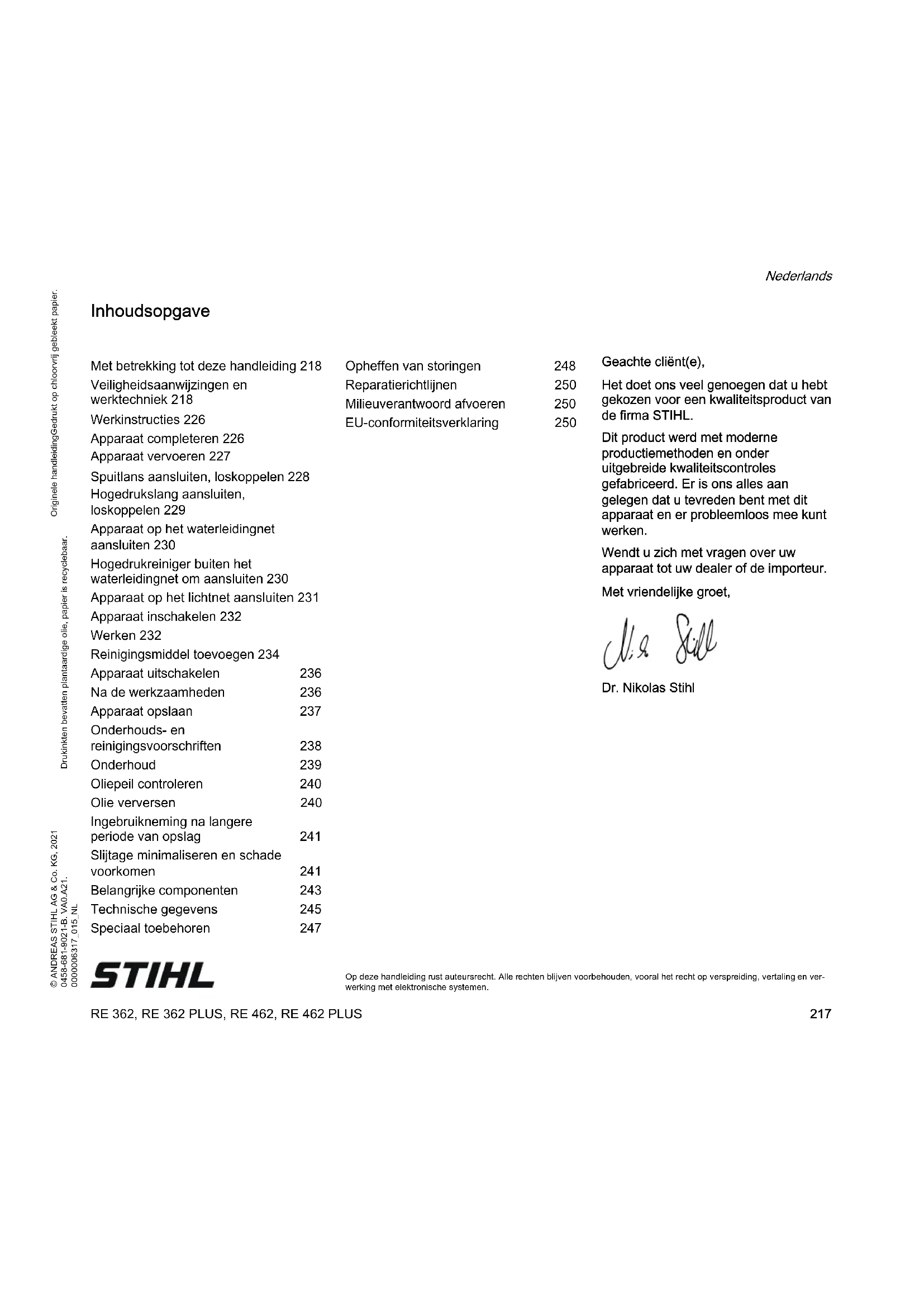 Op deze handleiding rust auteursrecht. Alle rechten blijven voorbehouden, vooral het recht op verspreiding, vertaling en ver- werking met elektronische systemen. Inhoudsopgave Geachte cliënt(e), Het doet ons veel genoegen dat u hebt gekozen voor een kwaliteitsproduct van de firma STIHL. Dit product werd met moderne productiemethoden en onder uitgebreide kwaliteitscontroles gefabriceerd. Er is ons alles aan gelegen dat u tevreden bent met dit apparaat en er probleemloos mee kunt werken. Wendt u zich met vragen over uw apparaat tot uw dealer of de importeur. Met vriendelijke groet, Dr. Nikolas Stihl Met betrekking tot deze handleiding 218 Veiligheidsaanwijzingen en werktechniek 218 Werkinstructies 226 Apparaat completeren 226 Apparaat vervoeren 227 Spuitlans aansluiten, loskoppelen 228 Hogedrukslang aansluiten, loskoppelen 229 Apparaat op het waterleidingnet aansluiten 230 Hogedrukreiniger buiten het waterleidingnet om aansluiten 230 Apparaat op het lichtnet aansluiten 231 Apparaat inschakelen 232 Werken 232 Reinigingsmiddel toevoegen 234 Apparaat uitschakelen 236 Na de werkzaamheden 236 Apparaat opslaan 237 Onderhouds- en reinigingsvoorschriften 238 Onderhoud 239 Oliepeil controleren 240 Olie verversen 240 Ingebruikneming na langere periode van opslag 241 Slijtage minimaliseren en schade voorkomen 241 Belangrijke componenten 243 Technische gegevens 245 Speciaal toebehoren 247 Opheffen van storingen 248 Reparatierichtlijnen 250 Milieuverantwoord afvoeren 250 EU-conformiteitsverklaring 250RE 362, RE 362 PLUS, RE 462, RE 462 PLUS Nederlands