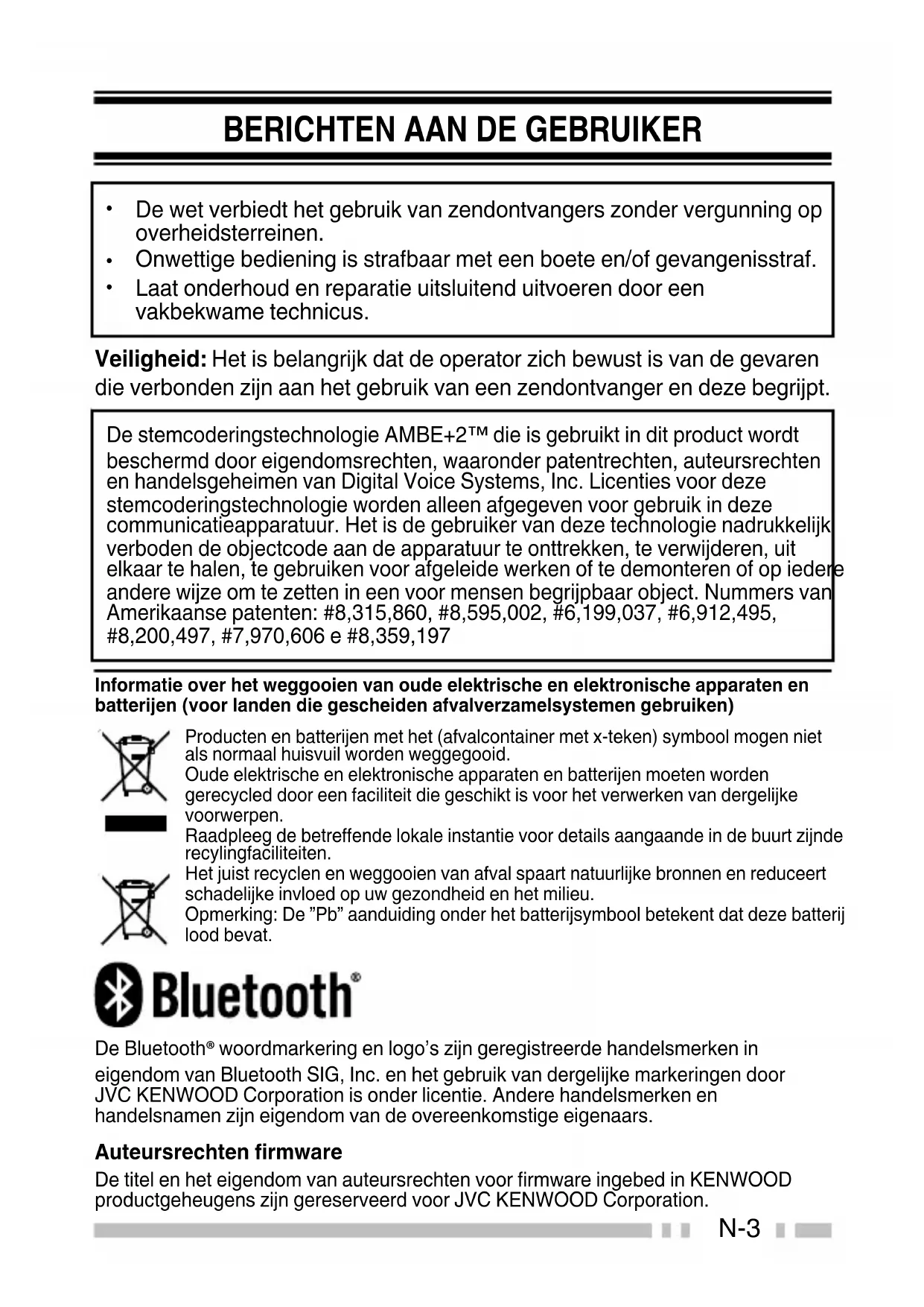 De Bluetooth woordmarkering en logo’s zijn geregistreerde handelsmerken ineigendom van Bluetooth SIG, Inc. en het gebruik van dergelijke markeringen doorJVC KENWOOD Corporation is onder licentie. Andere handelsmerken enhandelsnamen zijn eigendom van de overeenkomstige eigenaars. Auteursrechten firmware De titel en het eigendom van auteursrechten voor firmware ingebed in KENWOODproductgeheugens zijn gereserveerd voor JVC KENWOOD Corporation. N-3VOORZORGSMAATREGELEN
