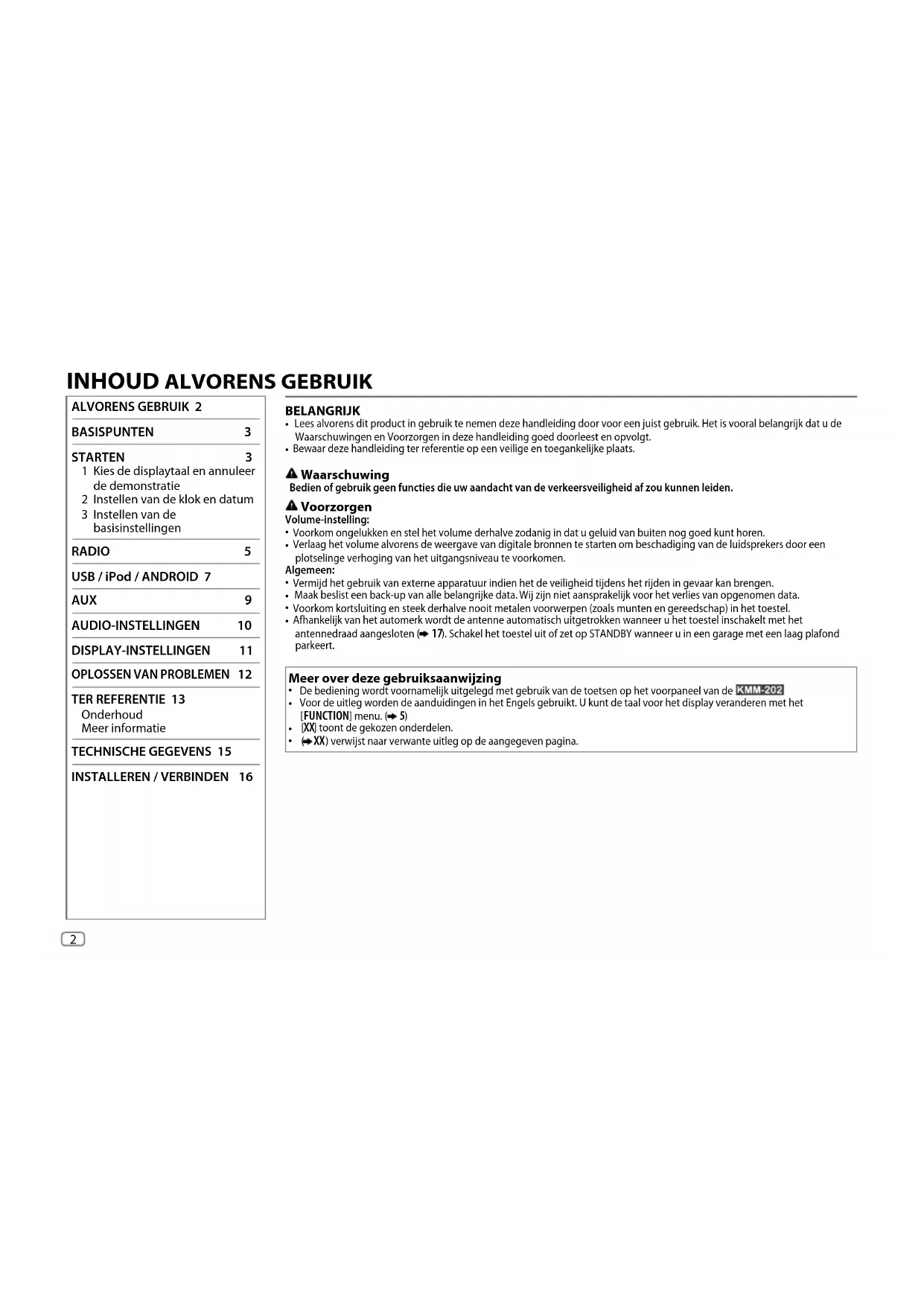 ) verwijst naar verwante uitleg op de aangegeven pagina. ALVORENS GEBRUIK 2 BASISPUNTEN 3 STARTEN 3 1 Kies de displaytaal en annuleer de demonstratie 2 Instellen van de klok en datum 3 Instellen van de basisinstellingen RADIO 5 USB / iPod / ANDROID 7 AUX 9 AUDIO-INSTELLINGEN 10 DISPLAY-INSTELLINGEN 11