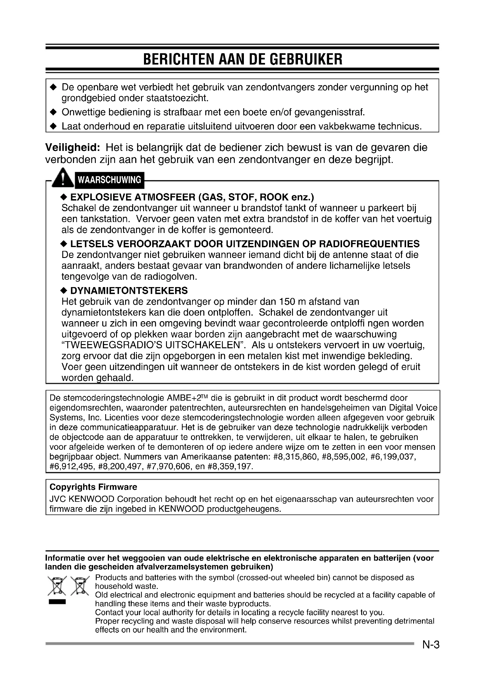 die is gebruikt in dit product wordt beschermd door eigendomsrechten, waaronder patentrechten, auteursrechten en handelsgeheimen van Digital Voice Systems, Inc. Licenties voor deze stemcoderingstechnologie worden alleen afgegeven voor gebruik in deze communicatieapparatuur. Het is de gebruiker van deze technologie nadrukkelijk verboden de objectcode aan de apparatuur te onttrekken, te verwijderen, uit elkaar te halen, te gebruiken voor afgeleide werken of te demonteren of op iedere andere wijze om te zetten in een voor mensen begrijpbaar object. Nummers van Amerikaanse patenten: #8,315,860, #8,595,002, #6,199,037, #6,912,495, #8,200,497, #7,970,606, en #8,359,197. Copyrights Firmware JVC KENWOOD Corporation behoudt het recht op en het eigenaarsschap van auteursrechten voor firmware die zijn ingebed in KENWOOD productgeheugens. Informatie over het weggooien van oude elektrische en elektronische apparaten en batterijen (voor landen die gescheiden afvalverzamelsystemen gebruiken) Products and batteries with the symbol (crossed-out wheeled bin) cannot be disposed as household waste. Old electrical and electronic equipment and batteries should be recycled at a facility capable of handling these items and their waste byproducts. Contact your local authority for details in locating a recycle facility nearest to you. Proper recycling and waste disposal will help conserve resources whilst preventing detrimental effects on our health and the environment.N-4 VOORZORGSMAATREGELEN Neem de volgende voorzorgsmaatregelen in acht om brand, lichamelijk letsel en schade aan de zendontvanger te vermijden.