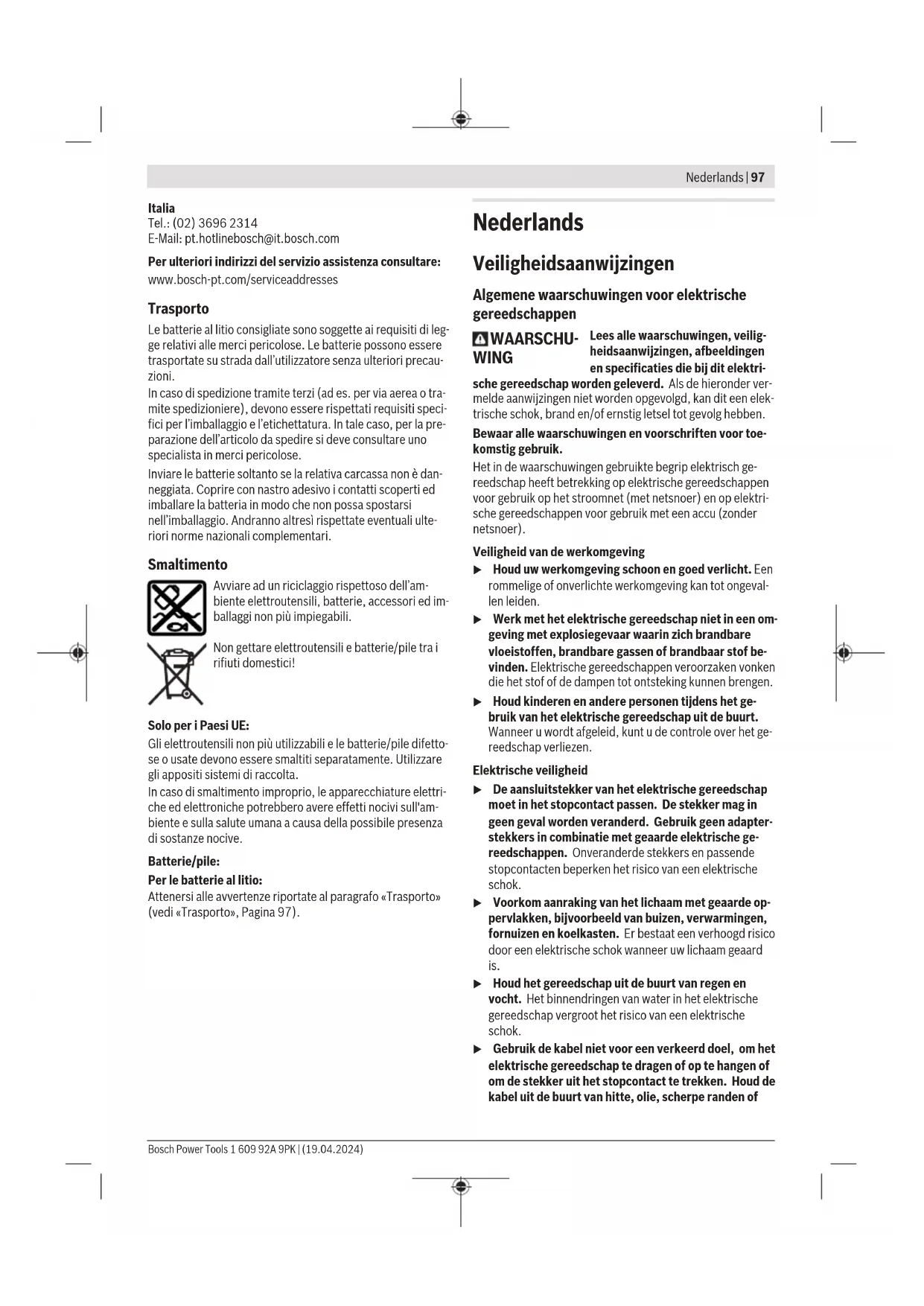 1 609 92A 9PK | (19.04.2024) Bosch Power ToolsNederlands | 105 – Zet de apparaatvoeten van het elektrische gereedschap met gangbare lijmklemmen op het werkoppervlak vast. Montage op een Bosch werktafel De GTA-werktafels van Bosch bieden het elektrische gereed- schap houvast op elke ondergrond door in hoogte verstelba- re voeten. De werkstuksteunen van de werktafels dienen ter ondersteuning van lange werkstukken. u Lees alle waarschuwingen en instructies die bij de werktafel zijn gevoegd. Als de waarschuwingen en aan- wijzingen niet in acht worden genomen, kan dit een elek- trische schok, brand en/of ernstig letsel tot gevolg heb- ben. u Bouw de werktafel correct op, voordat u het elektri- sche gereedschap monteert. Een juiste opbouw is van belang om het risico van bezwijken te voorkomen. – Monteer het elektrische gereedschap in de transport- stand op de werktafel. Flexibele opstelling (niet aanbevolen!) (zie afbeelding B3) Als het bij wijze van uitzondering niet mogelijk is om het elek- trisch gereedschap op een vlak en stabiel werkoppervlak te monteren, dan kunt u het provisorisch met kantelbeveiliging plaatsen. u Zonder de kantelbeveiliging staat het elektrisch ge- reedschap niet stabiel en kan vooral bij het zagen van maximale horizontale en/of verticale verstekhoeken kantelen. – Draai de kantelbeveiliging (18) zover in of uit tot het elek- trische gereedschap recht op het werkoppervlak staat. Afzuiging van stof en spanen Stof van materialen zoals loodhoudende verf, enkele hout- soorten, mineralen en metaal kan schadelijk voor de gezond- heid zijn. Aanraking of inademing van stof kan leiden tot al- lergische reacties en/of luchtwegaandoeningen bij de ge- bruiker of personen die zich in de omgeving bevinden. Bepaalde soorten stof, bijvoorbeeld van eiken- en beuken- hout, gelden als kankerverwekkend, in het bijzonder in com- binatie met additieven voor houtbehandeling (chromaat en houtbeschermingsmiddelen). Asbesthoudend materiaal mag alleen door gespecialiseerde vakmensen worden be- werkt. – Gebruik indien mogelijk een voor het materiaal geschikte stofafzuiging. – Zorg voor een goede ventilatie van de werkplek. – Er wordt geadviseerd om een stofmasker met filterklasse P2 te dragen. Neem de in uw land geldende voorschriften voor de te be- werken materialen in acht. u Vermijd ophoping van stof op de werkplek. Stof kan gemakkelijk ontbranden. De afzuiging van stof en spanen kan geblokkeerd worden door stof, spanen of fragmenten van het werkstuk. – Schakel het elektrische gereedschap uit en neem de accu eruit. – Wacht tot het zaagblad volledig tot stilstand is gekomen. – Stel de oorzaak van de blokkering vast en maak deze on- gedaan. Eigen afzuiging (zie afbeelding C) Voor het eenvoudig opvangen van de spanen gebruikt u de meegeleverde stofzak (37). – Zet de transportgreep (3) recht omhoog. – Steek en draai de stofzak (37) zodanig in de afzuigadap- ter (50) dat de pen van de stofzak in de uitsparing op de afzuigadapter vastklikt. De stofzak mag tijdens het zagen nooit met bewegende de- len van de machine in aanraking komen. Maak de stofzak op tijd leeg. u Controleer en reinig de stofzak na elk gebruik. u Verwijder de stofzak bij het zagen van aluminium, om brandgevaar te voorkomen. Externe afzuiging Voor de afzuiging kunt u op de afzuigadapter (50) ook een stofzuigerslang (Ø 35 mm) aansluiten. – Verbind de stofzuigerslang met de afzuigadapter (50). De stofzuiger moet geschikt zijn voor het te bewerken mate- riaal. Gebruik bij het afzuigen van voor de gezondheid bijzonder gevaarlijk, kankerverwekkend of droog stof een speciale zui- ger. Zaagblad wisselen (zie afbeelding D1−D4) u Neem de accu vóór alle werkzaamheden aan het elek- trische gereedschap (bijv. onderhoud, wisselen van accessoires, enz.) uit het elektrische gereedschap. Bij per ongeluk bedienen van de aan/uit-schakelaar bestaat gevaar voor letsel. u Draag werkhandschoenen bij de montage van het zaagblad. Bij het aanraken van het zaagblad bestaat ver- wondingsgevaar. Gebruik alleen zaagbladen met een maximaal toegestaan toerental dat hoger is dan het onbelaste toerental van het elektrische gereedschap. Gebruik alleen zaagbladen die voldoen aan de in deze ge- bruiksaanwijzing vermelde specificaties, volgens EN847‑1 zijn gecontroleerd en dienovereenkomstig zijn gemarkeerd. Gebruik alleen zaagbladen die door de fabrikant van het elektrische gereedschap werden aanbevolen en die geschikt zijn voor het materiaal dat u wilt bewerken. Dit voorkomt oververhitting van de zaagtanden bij het zagen. Zaagblad demonteren – Zet het elektrische gereedschap in werkstand. – Draai de pendelbeschermkap (10) naar achter en houd de pendelbeschermkap in deze positie. – Draai de binnenzeskantschroef (51) met de binnenzes- kantsleutel (6mm) (43) en duw tevens op de blokkering van de uitgaande as (31) tot deze vastklikt. Bosch Power Tools 1 609 92A 9PK | (19.04.2024)106 | Nederlands – Blijf duwen op de blokkering van de uitgaande as (31) en draai de binnenzeskantschroef (51) er met de klok mee uit (linkse schroefdraad!). – Neem de spanflens (52) weg. – Verwijder het zaagblad (30). – Beweeg de pendelbeschermkap langzaam weer omlaag. Zaagblad monteren u Let er bij de montage op dat de snijrichting van de tan- den (richting van de pijl op het zaagblad) overeen- komt met de richting van de pijl op de beschermkap. Reinig indien nodig vóór de montage alle te monteren delen. – Draai de pendelbeschermkap (10) naar achter en houd de pendelbeschermkap in deze positie. – Zet het nieuwe zaagblad op de binnenste spanflens (53). – Breng de spanflens (52) en de binnenzeskantschroef (51) aan. Duw op de blokkering van de uitgaande as (31) tot deze vastklikt en draai de binnenzeskantschroef tegen de klok in (linksom) vast. – Beweeg de pendelbeschermkap langzaam weer omlaag. Gebruik u Neem de accu vóór alle werkzaamheden aan het elek- trische gereedschap (bijv. onderhoud, wisselen van accessoires, enz.) uit het elektrisc