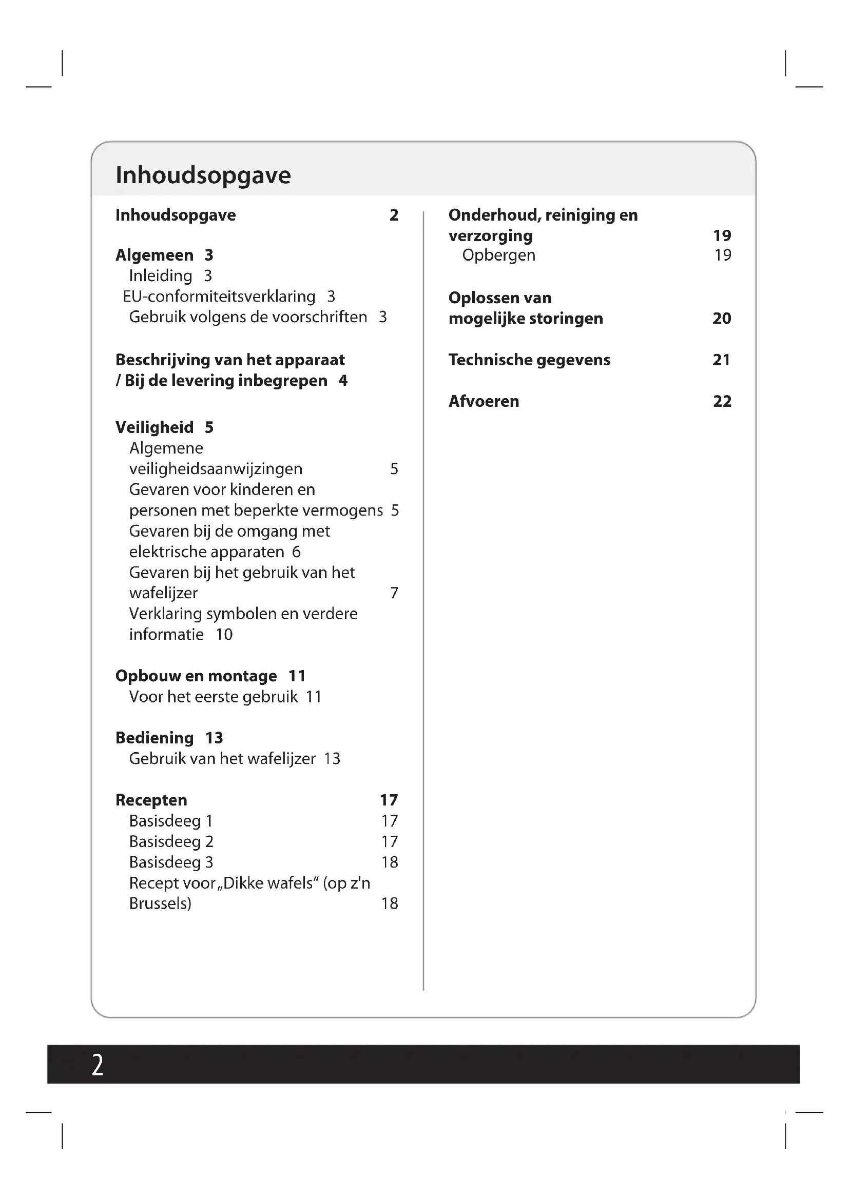 Inhoudsopgave 2 Algemeen 3 Inleiding 3 EU-conformiteitsverklaring 3 Gebruik volgens de voorschriften 3 Beschrijving van het apparaat / Bij de levering inbegrepen 4 Veiligheid 5 Algemene veiligheidsaanwijzingen 5 Gevaren voor kinderen en personen met beperkte vermogens 5 Gevaren bij de omgang met elektrische apparaten 6 Gevaren bij het gebruik van het wafelijzer 7 Verklaring symbolen en verdere informatie 10 Opbouw en montage 11 Voor het eerste gebruik 11 Bediening 13 Gebruik van het wafelijzer 13 Recepten 17 Basisdeeg 1 17 Basisdeeg 2 17 Basisdeeg 3 18 Recept voor „Dikke wafels“ (op z'n Brussels) 18 Onderhoud, reiniging en verzorging 19 Opbergen 19 Oplossen van mogelijke storingen 20 Technische gegevens 21 Afvoeren 22 Inhoudsopgave3