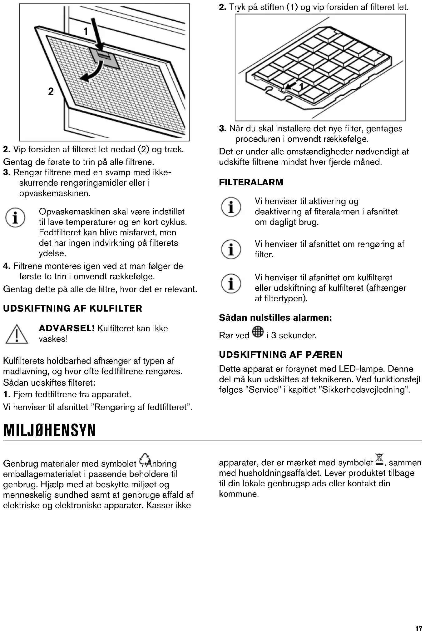 WAARSCHUWING! De koolfilter is NIET afwasbaar! De verzadigingstijd van de koolfilter varieert afhankelijk van het type koken en de regelmaat van het reinigen van de vetfilter. Om de filter te vervangen: