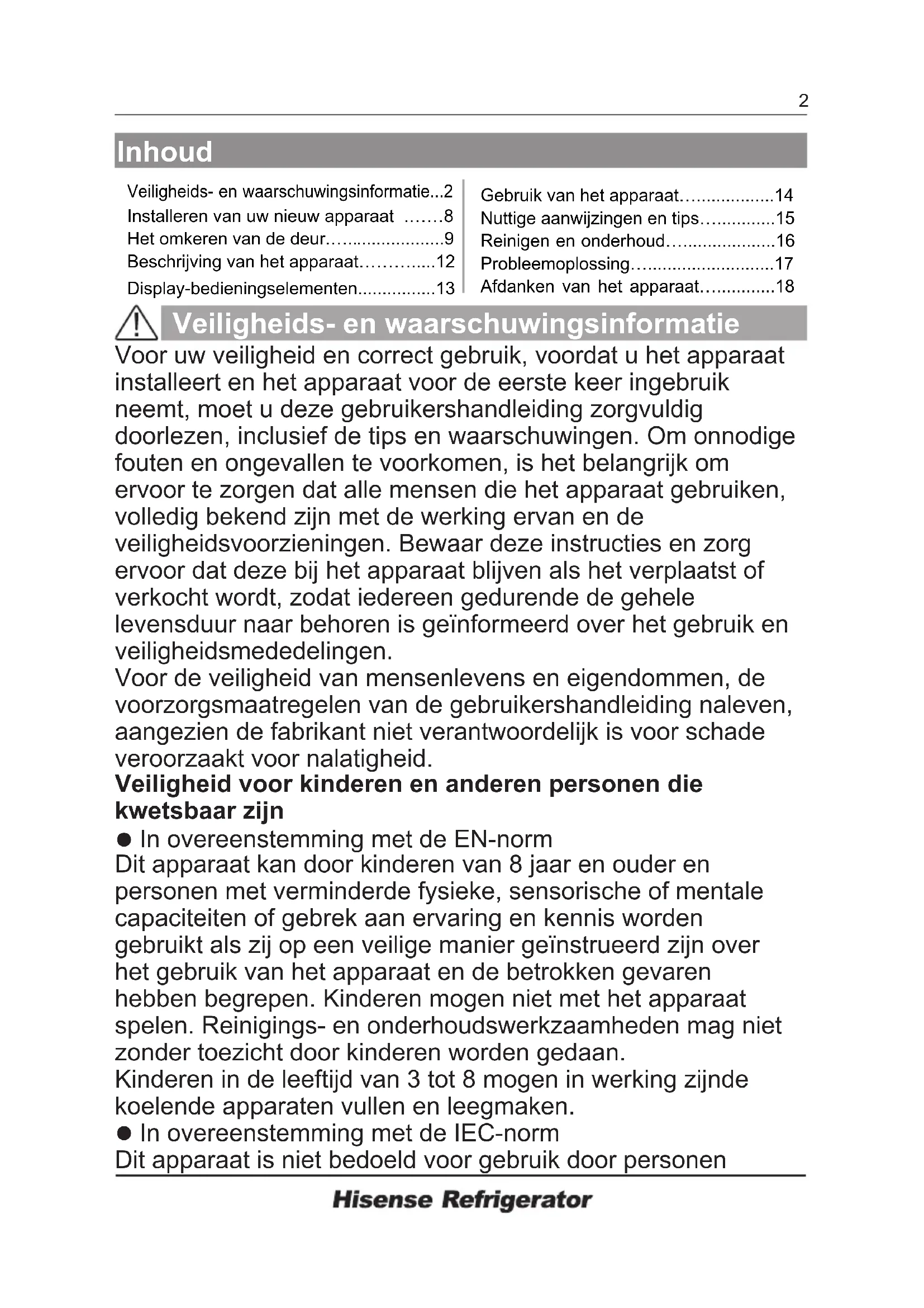 Frutti di mare (pesce, gamberetti, molluschi), prodotti ittici e prodotti a base di carne (raccomandati per 3 mesi, maggiore è il tempo di conservazione, peggiore è il gusto e la nutrizione), non adatti per prodotti freschi surgelati. Frutti di mare (pesce, gamberetti, molluschi), prodotti ittici e prodotti a base di carne (raccomandati per 3 mesi, maggiore è il tempo di conservazione, peggiore è il gusto e la nutrizione), non adatti per prodotti freschi surgelati. Frutti di mare (pesce, gamberetti, molluschi), prodotti ittici e prodotti a base di carne (raccomandati per 2 mesi, maggiore è il tempo di conservazione, peggiore è il gusto e la nutrizione), non adatti per prodotti freschi surgelati. Frutti di mare (pesce, gamberetti, molluschi), prodotti ittici e prodotti a base di carne (raccomandati per 1 mesi, maggiore è il tempo di conservazione, peggiore è il gusto e la nutrizione), non adatti per prodotti freschi surgelati. Maiale fresco, manzo, pesce, pollo, alcuni alimenti confezionati, ecc. (si consiglia consumarli entro lo stesso giorno, preferibilmente non più di 3 giorni). Alimenti trattati parzialmente incapsulati (alimenti non congelabili) ≤-18 ≤-18 ≤-12 ≤-6 -6~0 Nota: conservare i vari alimenti in base agli scomparti o alla temperatura di conservazione ideale dei prodotti acquistati. - Se il frigorifero viene lasciato vuoto per lunghi periodi, spegnere, pulire, asciugare e lasciare lo sportello aperto per evitare lo sviluppo di muffa all'interno dell'apparecchio.GEBRUIKERHANDLEIDING Alvorens dit apparaat te gaan bedienen, moet u deze gebruikershandleiding zorgvuldig doorlezen en voor toekomstig gebruik bewaren Nederlands2 Veiligheids- en waarschuwingsinformatie In overeenstemming met de EN-norm Dit apparaat kan door kinderen van 8 jaar en ouder en personen met verminderde fysieke, sensorische of mentale capaciteiten of gebrek aan ervaring en kennis worden gebruikt als zij op een veilige manier geïnstrueerd zijn over het gebruik van het apparaat en de betrokken gevaren hebben begrepen. Kinderen mogen niet met het apparaat spelen. Reinigings- en onderhoudswerkzaamheden mag niet zonder toezicht door kinderen worden gedaan. Kinderen in de leeftijd van 3 tot 8 mogen in werking zijnde koelende apparaten vullen en leegmaken. In overeenstemming met de IEC-norm Dit apparaat is niet bedoeld voor gebruik door personen Voor uw veiligheid en correct gebruik, voordat u het apparaat installeert en het apparaat voor de eerste keer ingebruik neemt, moet u deze gebruikershandleiding zorgvuldig doorlezen, inclusief de tips en waarschuwingen. Om onnodige fouten en ongevallen te voorkomen, is het belangrijk om ervoor te zorgen dat alle mensen die het apparaat gebruiken, volledig bekend zijn met de werking ervan en de veiligheidsvoorzieningen. Bewaar deze instructies en zorg ervoor dat deze bij het apparaat blijven als het verplaatst of verkocht wordt, zodat iedereen gedurende de gehele levensduur naar behoren is geïnformeerd over het gebruik en veiligheidsmededelingen. Voor de veiligheid van mensenlevens en eigendommen, de voorzorgsmaatregelen van de gebruikershandleiding naleven, aangezien de fabrikant niet verantwoordelijk is voor schade veroorzaakt voor nalatigheid. Veiligheid voor kinderen en anderen personen die kwetsbaar zijn