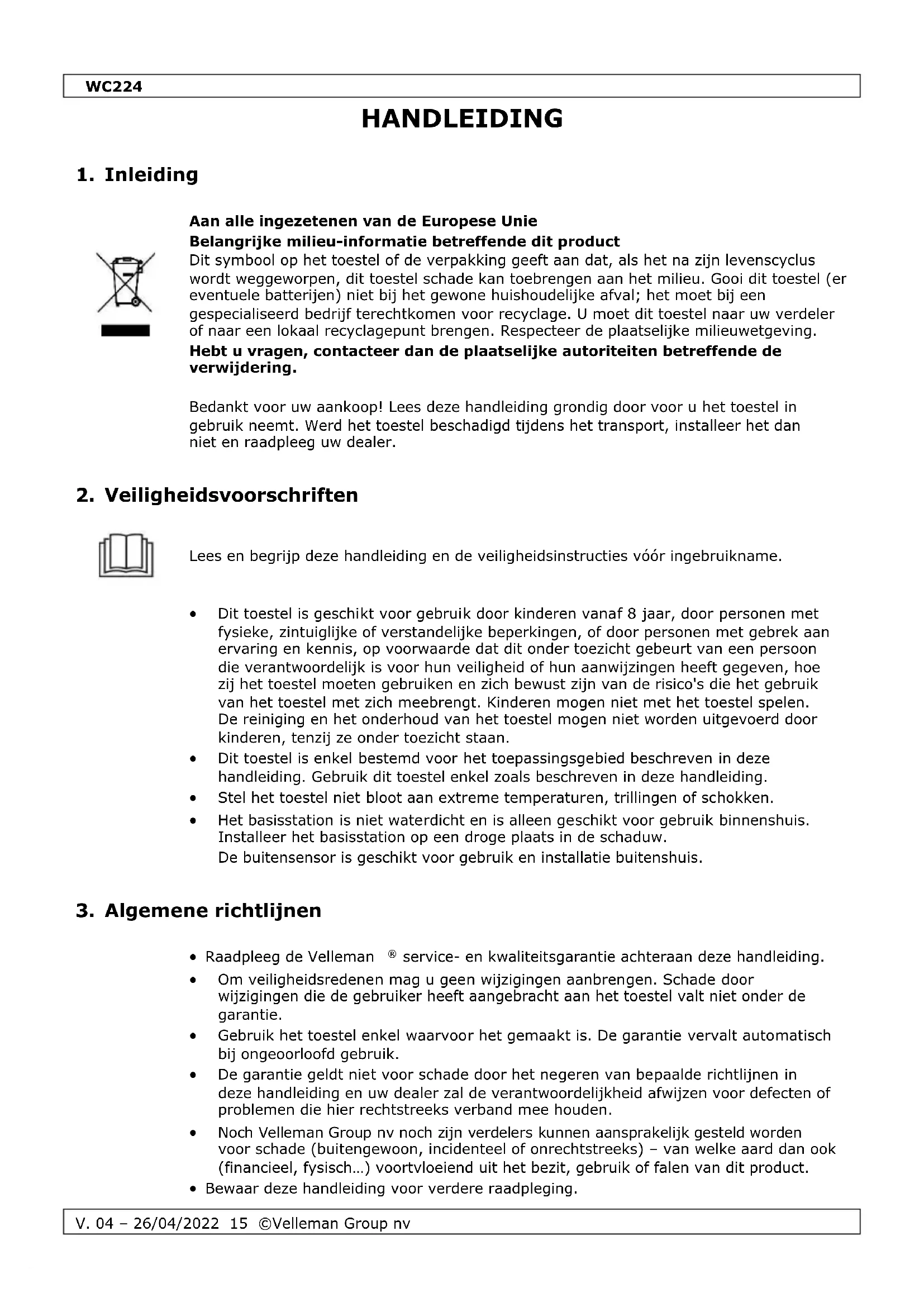 Velleman Group nv heeft het auteursrecht voor deze handleiding. Alle wereldwijde rechten voorbehouden. Het is niet toegestaan om deze handleiding of gedeelten ervan over te nemen, te kopiëren, te vertalen, te bewerken en op te slaan op een elektronisch medium zonder voorafgaande schriftelijke toestemming van de rechthebbende.WC224