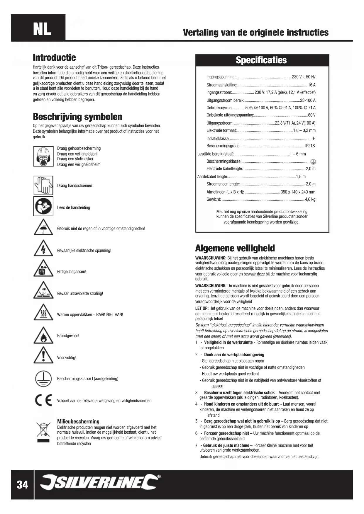 Specificaties Ingangsspanning: .....................................................230 V~, 50 Hz Stroomaansluiting:................................................................... 16 A Ingangsstroom: ..................... 230 V: 17,2 A (piek), 12,1 A (effectief) Uitgangsstroom bereik:.....................................................25-100 A Gebruikscyclus: ........... 50% @ 100 A, 60% @ 91 A, 100% @ 71 A Onbelaste uitgangsspanning:....................................................60 V Uitgangsstroom: .......................................22,8 V(71 A), 24 V(100 A) Elektrode formaat: ..................................................... 1,6 – 3,2 mm Isolatieklasse: ............................................................................... H Beschermingsgraad:..............................................................IP21S Lasdikte bereik (staal):.....................................................1 – 6 mm Beschermingsklasse:................................................................ Electrode kabellengte: ........................................................... 2,0 m Aardekabel lengte: .................................................................1,5 m Stroomsnoer lengte: .............................................................. 2,0 m Afmetingen (L x B x H): .................................. 350 x 140 x 240 mm Gewicht: ................................................................................4,6 kg Met het oog op onze aanhoudende productontwikkeling kunnen de specificaties van Silverline producten zonder voorafgaande kennisgeving worden gewijzigd. Algemene veiligheid WAARSCHUWING: Bij het gebruik van elektrische machines horen basis veiligheidsvoorzorgmaatregelingen opgevolgd te worden om de kans op brand, elektrische schokken en persoonlijk letsel te minimaliseren. Lees de instructies voor gebruik volledig door en bewaar deze bij de machine voor toekomstig gebruik.WAARSCHUWING: De machine is niet geschikt voor gebruik door personen met een verminderde mentale of fysieke bekwaamheid of een gebrek aan ervaring, tenzij de persoon wordt begeleid of geïnstrueerd door een persoon verantwoordelijk voor de veiligheidLET OP: Het gebruik van de machine voor doeleinden, anders dan waarvoor de machine is bestemd resulteert mogelijk in gevaarlijke situaties en serieus persoonlijk letselDe term “elektrisch gereedschap” in alle hieronder vermelde waarschuwingen heeft betrekking op uw elektrische gereedschap dat op de stroom is aangesloten (met een snoer) of met een accu wordt gevoed (snoerloos).1 - Veiligheid in de werkruimte - Rommelige en donkere ruimtes leiden vaak tot ongelukken.2 - Denk aan de werkplaatsomgeving - Stel gereedschap niet bloot aan regen - Gebruik gereedschap niet in vochtige of natte omstandigheden - Houdt uw werkplaats goed verlicht - Gebruik gereedschap niet in de nabijheid van ontvlambare vloeistoffen of gassen3 - Bescherm uzelf tegen elektrische schok – Voorkom het contact met geaarde oppervlakken (als leidingen, radiatoren, koelkasten).4 - Houd kinderen en omstanders uit de buurt – Laat mensen, vooral kinderen, de machine en verlengsnoeren niet aanraken en houd ze op afstand5 - Berg gereedschap wat niet in gebruik is op – Berg gereedschap dat niet in gebruikt is op een droge plek, buiten het bereik van kinderen op6 - Forceer gereedschap niet – Uw machine functioneert optimaal op de bestemde gebruikssnelheid7 - Gebruik de juiste machine – Forceer kleine machine niet voor het uitvoeren van grote werkzaamheden. Gebruik gereedschap niet voor doeleinden waarvoor ze niet bestemd zijn. Beschrijving symbolen Op het gegevensplaatje van uw gereedschap kunnen zich symbolen bevinden. Deze symbolen belangrijke informatie over het product of instructies voor het gebruik. Draag gehoorbescherming Draag een veiligheidsbrilDraag een stofmaskerDraag een veiligheidshelmDraag handschoenenLees de handleidingGebruik niet de regen of in vochtige omstandigheden!Gevaarlijke elektrische spanning!Giftige lasgassen!Gevaar ultraviolette straling!Warme oppervlakken – RAAK NIET AAN!Brandgevaar!Voorzichtig!Beschermingsklasse I (aardgeleiding)Voldoet aan de relevante wetgeving en veiligheidsnormen Milieubescherming Elektrische producten mogen niet worden afgevoerd met het normale huisvuil. Indien de mogelijkheid bestaat, dient u het product te recyclen. Vraag uw gemeente of winkelier om advies betreffende recyclen Vertaling van de originele instructies Introductie Hartelijk dank voor de aanschaf van dit Triton- gereedschap. Deze instructies bevatten informatie die u nodig hebt voor een veilige en doeltreffende bediening van dit product. Dit product heeft unieke kenmerken. Zelfs als u bekend bent met gelijksoortige producten dient u deze handleiding zorgvuldig door te lezen, zodat u in staat bent alle voordelen te benutten. Houd deze handleiding bij de hand en zorg ervoor dat alle gebruikers van dit gereedschap de handleiding hebben gelezen en volledig hebben begrepen. 846386_Z1MANPRO1.indd 34 20/07/2016 16:31www.silverlinetools.com