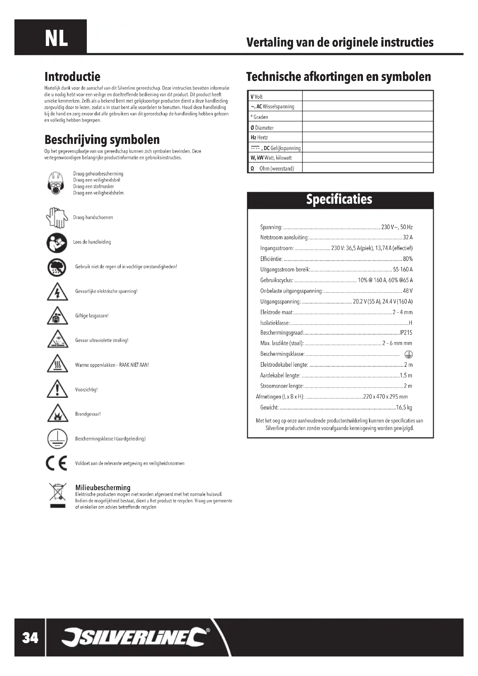 Vertaling van de originele instructies Technische afkortingen en symbolen Beschrijving symbolen Ophetgegevensplaatjevanuwgereedschapkunnenzichsymbolenbevinden.Dezevertegenwoordigenbelangrijkeproductinformatieengebruiksinstructies.Draag gehoorbescherming Draag een veiligheidsbril Draag een stofmaskerDraag een veiligheidshelmDraag handschoenenLees de handleidingGebruik niet de regen of in vochtige omstandigheden!Gevaarlijkeelektrischespanning!Giftige lasgassen!Gevaar ultraviolette straling!Warme oppervlakken – RAAK NIET AAN!Voorzichtig!Brandgevaar!Beschermingsklasse I (aardgeleiding)Voldoet aan de relevante wetgeving en veiligheidsnormenMilieubescherming Elektrische producten mogen niet worden afgevoerd met het normale huisvuil. Indiendemogelijkheidbestaat,dientuhetproductterecyclen.Vraaguwgemeenteofwinkelieromadviesbetreffenderecyclen Introductie HartelijkdankvoordeaanschafvanditSilverlinegereedschap.Dezeinstructiesbevatteninformatiedie u nodig hebt voor een veilige en doeltreffende bediening van dit product. Dit product heeft uniekekenmerken.Zelfsalsubekendbentmetgelijksoortigeproductendientudezehandleidingzorgvuldig door te lezen, zodat u in staat bent alle voordelen te benutten. Houd deze handleiding bijdehandenzorgervoordatallegebruikersvanditgereedschapdehandleidinghebbengelezenen volledig hebben begrepen. Specicaties Spanning: ........................................................................... 230 V~, 50 Hz Netstroom aansluiting: ........................................................................32 A Ingangsstroom: ........................... 230 V: 36,5 A (piek), 13,74 A (effectief) Efciëntie: ............................................................................................80% Uitgangsstroombereik: ............................................................... 55-160 A Gebruikscyclus: ................................................. 10% @ 160 A, 60% @65 A Onbelaste uitgangsspanning: .............................................................48 V Uitgangsspanning: ....................................... 20.2 V (55 A), 24.4 V (160 A) Elektrode maat: ............................................................................2 – 4 mm Isolatieklasse: ............................................................................................H Beschermingsgraad:..........................................................................IP21S Max. lasdikte (staal): ............................................................ 2 – 6 mm mm Beschermingsklasse: ......................................................................... Elektrodekabel lengte: .........................................................................2 m Aardekabel lengte: ............................................................................1,5 m Stroomsnoer lengte: ............................................................................. 2 m Afmetingen (L x B x H): .............................................220 x 470 x 295 mm Gewicht: ..........................................................................................16,5 kg MethetoogoponzeaanhoudendeproductontwikkelingkunnendespecicatiesvanSilverlineproductenzondervoorafgaandekennisgevingwordengewijzigd.V Volt~, AC Wisselspanning° GradenØ DiameterHz Hertz , DC GelijkspanningW, kW Watt, kilowattΩ Ohm (weerstand)466888_Manual.indd 34 08/08/2017 14:20Booglasmachine 466888