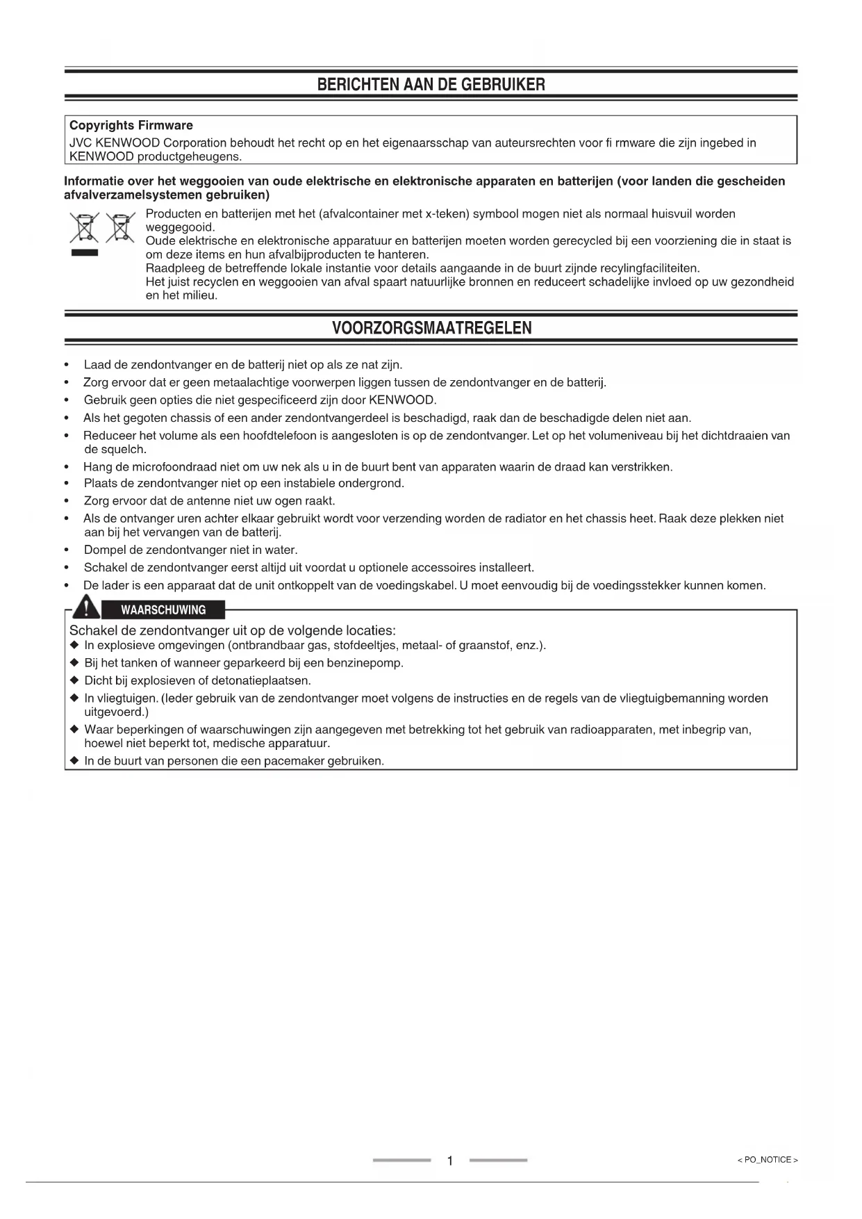 Copyrights Firmware JVC KENWOOD Corporation behoudt het recht op en het eigenaarsschap van auteursrechten voor fi rmware die zijn ingebed in KENWOOD productgeheugens. Informatie over het weggooien van oude elektrische en elektronische apparaten en batterijen (voor landen die gescheiden afvalverzamelsystemen gebruiken) Producten en batterijen met het (afvalcontainer met x-teken) symbool mogen niet als normaal huisvuil worden weggegooid. Oude elektrische en elektronische apparatuur en batterijen moeten worden gerecycled bij een voorziening die in staat is om deze items en hun afvalbijproducten te hanteren. Raadpleeg de betreffende lokale instantie voor details aangaande in de buurt zijnde recylingfaciliteiten. Het juist recyclen en weggooien van afval spaart natuurlijke bronnen en reduceert schadelijke invloed op uw gezondheid en het milieu. VOORZORGSMAATREGELEN
