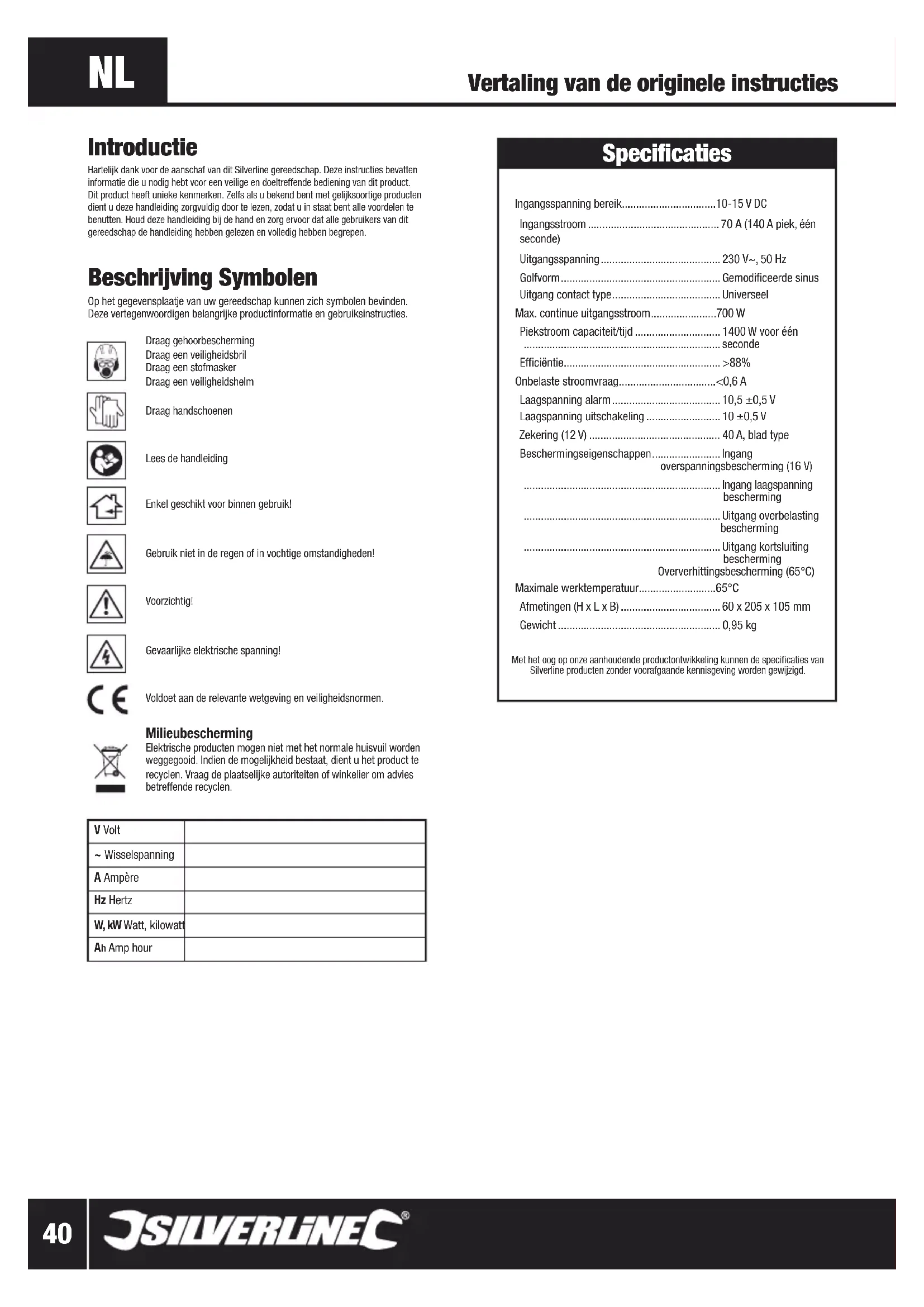 T-130˚ Specificaties Ingangsspanning bereik ................................. 10-15 V DC Ingangsstroom .............................................. 70 A (140 A piek, één seconde) Uitgangsspanning .......................................... 230 V~, 50 Hz Golfvorm ........................................................ Gemodificeerde sinus Uitgang contact type ...................................... Universeel Max. continue uitgangsstroom .......................700 W Piekstroom capaciteit/tijd .............................. 1400 W voor één ..................................................................... seconde Efficiëntie ....................................................... >88% Onbelaste stroomvraag .................................. <0,6 A Laagspanning alarm ...................................... 10,5 ±0,5 V Laagspanning uitschakeling .......................... 10 ±0,5 V Zekering (12 V) .............................................. 40 A, blad type Beschermingseigenschappen ........................ Ingang overspanningsbescherming (16 V) ..................................................................... Ingang laagspanning bescherming ..................................................................... Uitgang overbelasting bescherming ..................................................................... Uitgang kortsluiting bescherming Oververhittingsbescherming (65°C) Maximale werktemperatuur ........................... 65°C Afmetingen (H x L x B) ................................... 60 x 205 x 105 mm Gewicht ......................................................... 0,95 kg Met het oog op onze aanhoudende productontwikkeling kunnen de specificaties van Silverline producten zonder voorafgaande kennisgeving worden gewijzigd. V Volt ~ Wisselspanning A Ampère Hz Hertz W, kW Watt, kilowatt Ah Amp hour Vertaling van de originele instructies Introductie Hartelijk dank voor de aanschaf van dit Silverline gereedschap. Deze instructies bevatten informatie die u nodig hebt voor een veilige en doeltreffende bediening van dit product. Dit product heeft unieke kenmerken. Zelfs als u bekend bent met gelijksoortige producten dient u deze handleiding zorgvuldig door te lezen, zodat u in staat bent alle voordelen te benutten. Houd deze handleiding bij de hand en zorg ervoor dat alle gebruikers van dit gereedschap de handleiding hebben gelezen en volledig hebben begrepen. 263764_Z1MANPRO1.indd 40 23/11/2016 16:22www.silverlinetools.com WAARSCHUWING: Wanneer de machine in Australië of Nieuw-Zeeland gebruikt wordt, met een lekstroom van 30 mA of lager, is het gebruik van een aardlekschakelaar aanbevolen