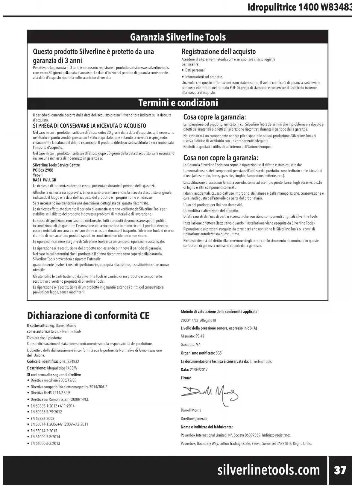 PLAATS Als dit product binnen 30 dagen van de aankoopdatum een fout heeft, breng het dan naar de winkelier waar u het heeft gekocht, met uw ontvangstbewijs, en met vermelding van de details van de storing. U kunt om een nieuwe vragen of om uw geld terug.Als dit product na de periode van 30 dagen een fout heeft, stuur het dan naar:Silverline Tools Service Centre PO Box 2988 Yeovil BA21 1WU, GBAlle claims moeten binnen de garantieperiode worden ingediend.U moet het originele ontvangstbewijs geven met de datum van aankoop, uw naam, adres en plaats van aankoop voordat er aan kan worden gewerkt.U moet nauwkeurige gegevens verschaffen van de fout die verholpen moet worden.Claimsdiebinnendegarantieperiodewordeningediend,wordendoorSilverlineToolsnagelopen om te kijken of het probleem een kwestie is van de materialen of de fabricage van het product.De verzendkosten worden niet vergoed. De geretourneerde items moeten voor de reparatie in een redelijk schone en veilige staat verkeren en moeten zorgvuldig worden verpakt om schade en letsel tijdens het vervoer te voorkomen. Ongeschikte en onveilige leveringen kunnen worden afgewezen.AlhetwerkwordtuitgevoerddoorSilverlineToolsofeenofciëlereparatiedienst.De garantieperiode wordt niet door de reparatie of vervanging van het product verlengd.Defecten waarvan wij beschouwen dat ze onder de garantie vallen, worden verholpen door middel van gratis reparatie van het gereedschap (exclusief verzendingskosten) of door vervanging door een gereedschap in perfecte staat van werking.De ingehouden gereedschappen of onderdelen die zijn vervangen, worden het eigendom van SilverlineTools.De reparatie of vervanging van het product onder garantie zijn voordelen die bijkomstig zijn aan uw wettelijke rechten als consument, en hebben daar geen invloed op. Wat is gedekt: Dereparatievanhetproduct,mitsnaartevredenheidvanSilverlineToolskanwordenvastgesteld dat de gebreken het gevolg zijn van defecte materialen of fabrieksfouten binnen de garantieperiode.Onderdelen die niet meer verkrijgbaar zijn en die niet meer worden vervaardigd worden door SilverlineToolsvervangendooreenfunctionelevervanging.Gebruik van dit product in de EU. Wat niet is gedekt: SilverlineToolsgeeftgeengarantieopreparatiesalsgevolgvan:Normale slijtage veroorzaakt door gebruik in overeenstemming met de bedieningsinstructies zoals zaagbladen, borstels, riemen, gloeilampen, batterijen enz.De vervanging van geleverde accessoires zoals boortjes, zaagbladen, schuurvellen, snijschrijven en aanverwante producten.Accidentele schade, storingen veroorzaakt door nalatigheid in gebruik of verzorging, misbruik, verwaarlozing, onvoorzichtige bediening en hantering van het product.Gebruik van het product voor andere doeleinden dan normaal huishoudelijk gebruik.Allesoortenwijzigingenenmodicatiesvanhetproduct.GebruikvanandereonderdelenenaccessoiresdandeorigineleonderdelenvanSilverlineTools.Defecteinstallatie(behalvewanneergeïnstalleerddoorSilverlineTools).ReparatiesofwijzigingendiezijnuitgevoerddooranderendanSilverlineToolsofdiensofciëlereparatiediensten.Behalve claims voor het recht op correctie van fouten van het gereedschap volgens de bepalingen van deze garantie zijn geen andere claims gedekt. EG-verklaring van overeenstemming De ondergetekende: Mr. Darrell MorrisGemachtigd door: SilverlineToolsVerklaart datDeze verklaring wordt verstrekt onder de volledige verantwoordelijkheid van de fabrikant. Het hierboven beschreven voorwerp is conform de desbetreffende communautaire harmonisatiewetgevingIdenticatienummer: 834832Beschrijving: 1400 W hogedrukreinigerVoldoet aan de volgende richtlijnen:• Machinerichtlijn 2006/42/EG• Elektromagnetische verenigbaarheid 2014/30/EU • RoHS-richtlijn2011/65/EU• Richtlijn 2000/14/EG Geluid door mobiele werktuigen• EN 60335-1:2012+A11:2014• EN 60335-2-79:2012• EN 62233:2008• EN 55014-1:2006+A1:2009+A2:2011• EN 55014-2:2015• EN 61000-3-2:2014• EN 61000-3-3:2013Toegepaste evaluatie methode2000/14/EG: Annex IIIGeluidsniveau dB(A)Gemeten: 93,42Gegarandeerd: 97Keuringsinstantie: SGSDe technische documentatie wordt bijgehouden door: SilverlineToolsDatum: 21-04-2017Handtekening:Darrell MorrisAlgemeen directeurNaam en adres van fabrikant:Powerbox International Limited, handelsregister nummer 06897059. Geregistreerd adres: Powerbox, BoundaryWay,LuftonTradingEstate,Yeovil,SomersetBA228HZ,VerenigdKoninkrijk 834832_Manual.indd 43 31/05/2017 10:35PL