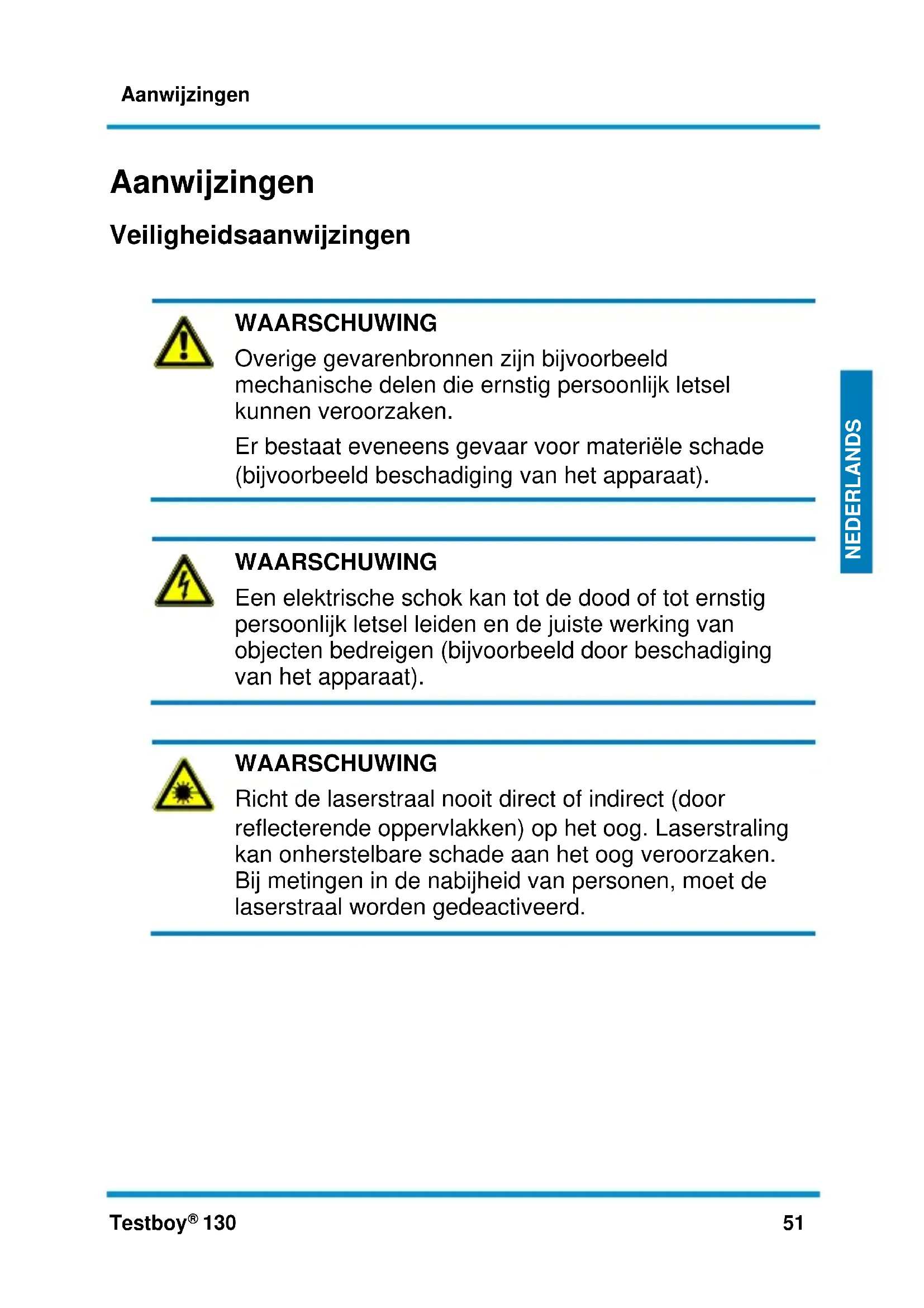 WAARSCHUWING Richt de laserstraal nooit direct of indirect (door reflecterende oppervlakken) op het oog. Laserstraling kan onherstelbare schade aan het oog veroorzaken. Bij metingen in de nabijheid van personen, moet de laserstraal worden gedeactiveerd.Aanwijzingen Testboy