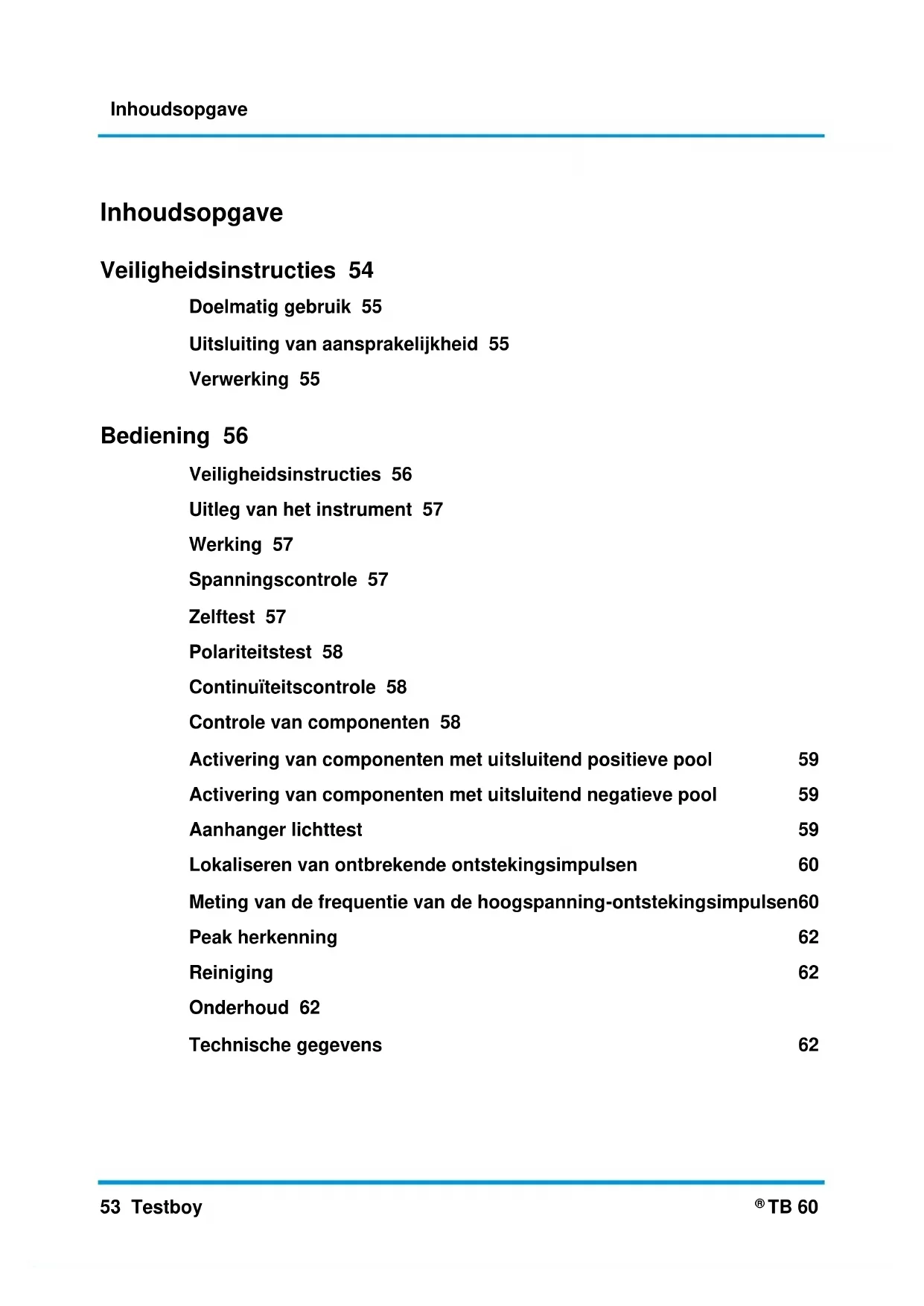 TB 60 ENGLISH Inhoudsopgave Veiligheidsinstructies 54 Doelmatig gebruik 55 Uitsluiting van aansprakelijkheid 55 Verwerking 55 Bediening 56 Veiligheidsinstructies 56 Uitleg van het instrument 57 Werking 57 Spanningscontrole 57 Zelftest 57 Polariteitstest 58 Continuïteitscontrole 58 Controle van componenten 58 Activering van componenten met uitsluitend positieve pool 59 Activering van componenten met uitsluitend negatieve pool 59 Aanhanger lichttest 59 Lokaliseren van ontbrekende ontstekingsimpulsen 60 Meting van de frequentie van de hoogspanning-ontstekingsimpulsen 60 Peak herkenning 62 Reiniging 62 Onderhoud 62 Technische gegevens 62Veiligheidsinstructies Testboy