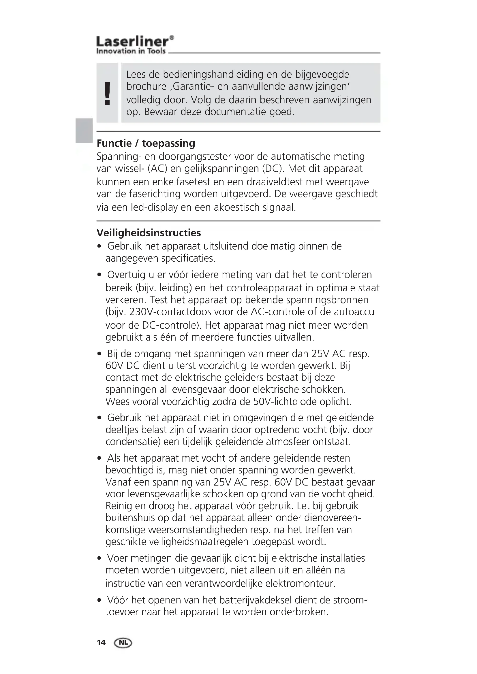 EU-bepalingen en afvoer Het apparaat voldoet aan alle van toepassing zijnde normen voor het vrije goederenverkeer binnen de EU. Dit product is een elektrisch apparaat en moet volgens de Europese richtlijn voor oude elektrische en elektronische apparatuur gescheiden verzameld en afgevoerd worden. Verdere veiligheids- en aanvullende instructies onder: www.laserliner.com/info Bepaling van de draaiveldrichting rechtsdraaiend veld linksdraaiend veldAC-tiveMaster Digital