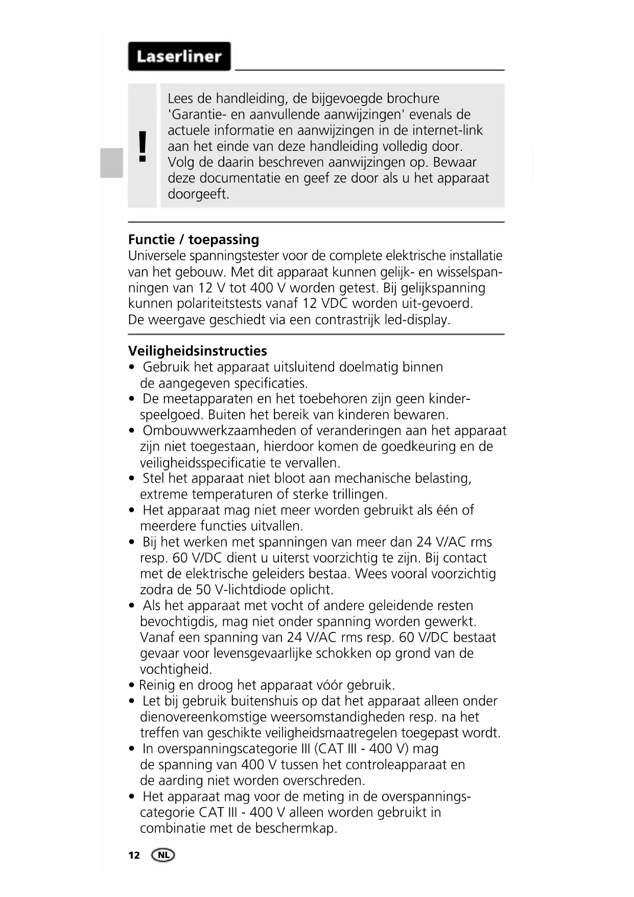 The voltage tester needs to be calibrated and tested on a regular basis to ensure it produces accurate measurement results. We recommend carrying out calibration once a year. EN12 Lees de handleiding, de bijgevoegde brochure 'Garantie- en aanvullende aanwijzingen' evenals de actuele informatie en aanwijzingen in de internet-link aan het einde van deze handleiding volledig door. Volg de daarin beschreven aanwijzingen op. Bewaar deze documentatie en geef ze door als u het apparaat doorgeeft.
