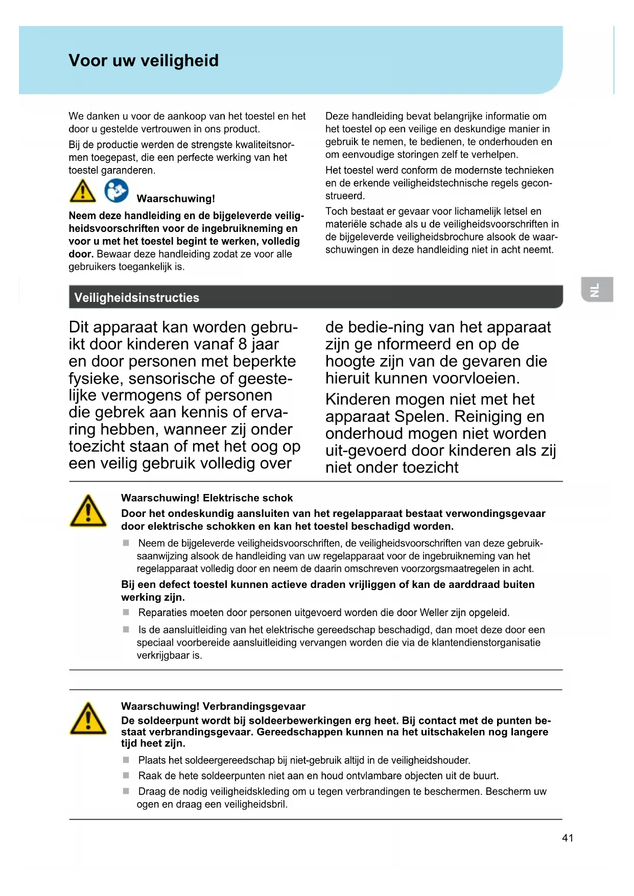 Voor uw veiligheid We danken u voor de aankoop van het toestel en het door u gestelde vertrouwen in ons product. Bij de productie werden de strengste kwaliteitsnor- men toegepast, die een perfecte werking van het toestel garanderen. Waarschuwing! Neem deze handleiding en de bijgeleverde veilig- heidsvoorschriften voor de ingebruikneming en voor u met het toestel begint te werken, volledig door. Bewaar deze handleiding zodat ze voor alle gebruikers toegankelijk is. Deze handleiding bevat belangrijke informatie om het toestel op een veilige en deskundige manier in gebruik te nemen, te bedienen, te onderhouden en om eenvoudige storingen zelf te verhelpen. Het toestel werd conform de modernste technieken en de erkende veiligheidstechnische regels gecon- strueerd. Toch bestaat er gevaar voor lichamelijk letsel en materiële schade als u de veiligheidsvoorschriften in de bijgeleverde veiligheidsbrochure alsook de waar- schuwingen in deze handleiding niet in acht neemt. Veiligheidsinstructies Dit apparaat kan worden gebru- ikt door kinderen vanaf 8 jaar en door personen met beperkte fysieke,sensorischeofgeeste- lijke vermogens of personen die gebrek aan kennis of erva- ring hebben, wanneer zij onder toezicht staan of met het oog op een veilig gebruik volledig over de bedie-ning van het apparaat zijn ge nformeerd en op de hoogte zijn van de gevaren die hieruit kunnen voorvloeien. Kinderen mogen niet met het apparaat Spelen. Reiniging en onderhoud mogen niet worden uit-gevoerd door kinderen als zij niet onder toezicht Waarschuwing! Elektrische schok Door het ondeskundig aansluiten van het regelapparaat bestaat verwondingsgevaar door elektrische schokken en kan het toestel beschadigd worden. Neem de bijgeleverde veiligheidsvoorschriften, de veiligheidsvoorschriften van deze gebruik- saanwijzing alsook de handleiding van uw regelapparaat voor de ingebruikneming van het regelapparaat volledig door en neem de daarin omschreven voorzorgsmaatregelen in acht. Bij een defect toestel kunnen actieve draden vrijliggen of kan de aarddraad buiten werking zijn. Reparaties moeten door personen uitgevoerd worden die door Weller zijn opgeleid. Is de aansluitleiding van het elektrische gereedschap beschadigd, dan moet deze door een speciaal voorbereide aansluitleiding vervangen worden die via de klantendienstorganisatie verkrijgbaar is. Waarschuwing! Verbrandingsgevaar De soldeerpunt wordt bij soldeerbewerkingen erg heet. Bij contact met de punten be- staat verbrandingsgevaar. Gereedschappen kunnen na het uitschakelen nog langere tijd heet zijn. Plaats het soldeergereedschap bij niet-gebruik altijd in de veiligheidshouder. Raak de hete soldeerpunten niet aan en houd ontvlambare objecten uit de buurt. Draag de nodig veiligheidskleding om u tegen verbrandingen te beschermen. Bescherm uw ogen en draag een veiligheidsbril.42
