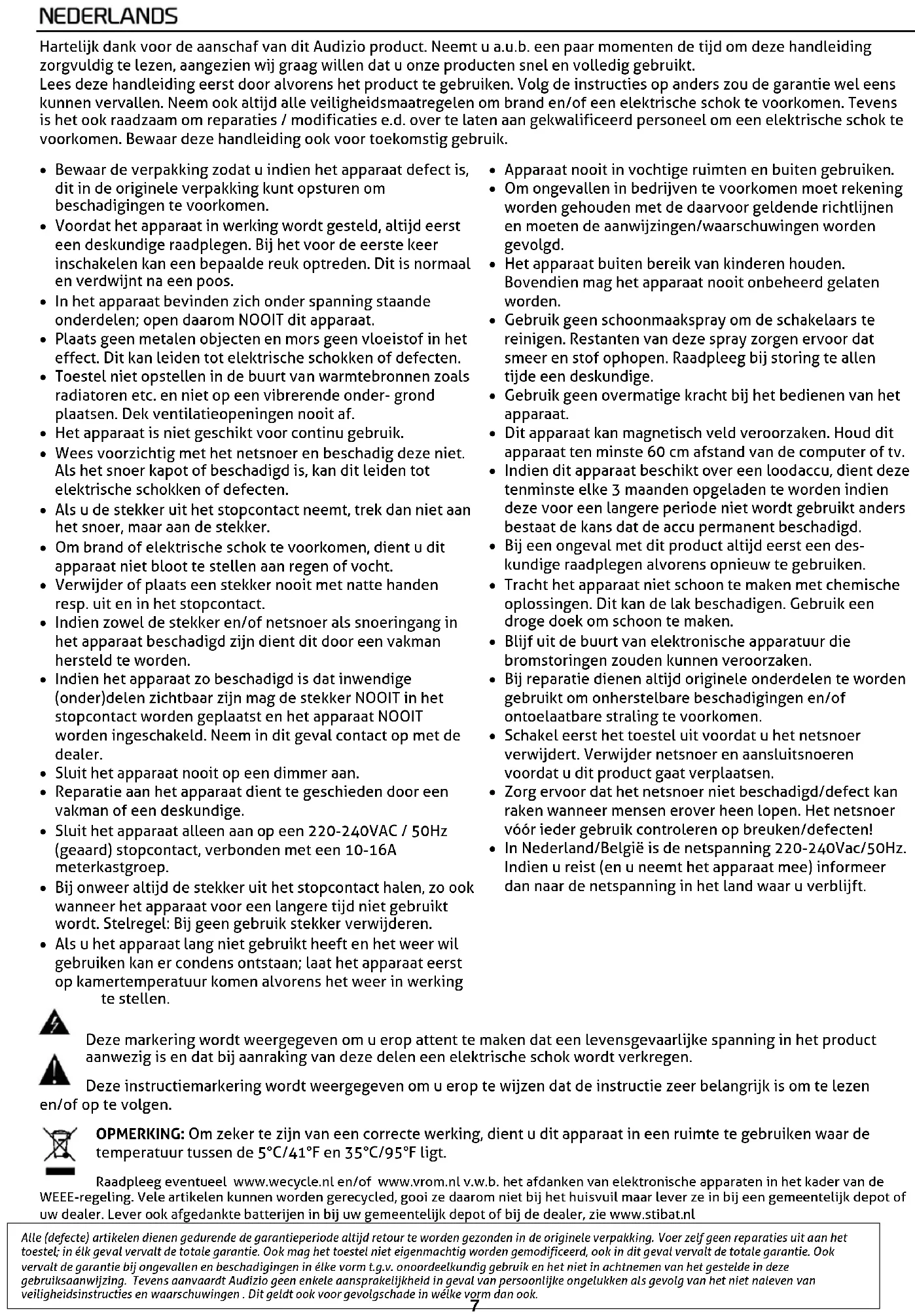 Alle (defecte) artikelen dienen gedurende de garantieperiode altijd retour te worden gezonden in de originele verpakking. Voer zelf geen reparaties uit aan het toestel; in élk geval vervalt de totale garantie. Ook mag het toestel niet eigenmachtig worden gemodificeerd, ook in dit geval vervalt de totale garantie. Ook vervalt de garantie bij ongevallen en beschadigingen in élke vorm t.g.v. onoordeelkundig gebruik en het niet in achtnemen van het gestelde in deze gebruiksaanwijzing. Tevens aanvaardt Audizio geen enkele aansprakelijkheid in geval van persoonlijke ongelukken als gevolg van het niet naleven van veiligheidsinstructies en waarschuwingen . Dit geldt ook voor gevolgschade in wélke vorm dan ook.8