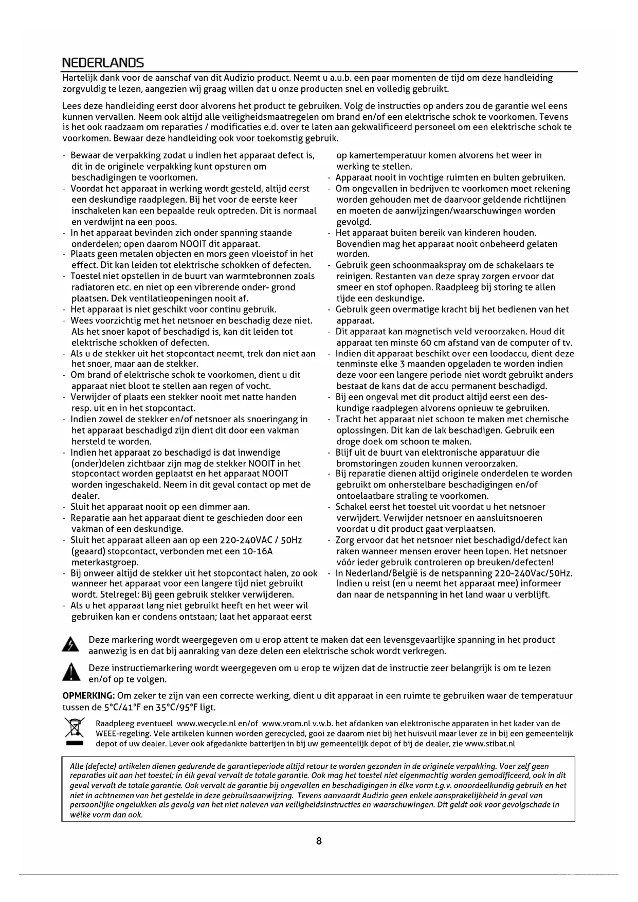 Alle (defecte) artikelen dienen gedurende de garantieperiode altijd retour te worden gezonden in de originele verpakking. Voer zelf geen reparaties uit aan het toestel; in élk geval vervalt de totale garantie. Ook mag het toestel niet eigenmachtig worden gemodificeerd, ook in dit geval vervalt de totale garantie. Ook vervalt de garantie bij ongevallen en beschadigingen in élke vorm t.g.v. onoordeelkundig gebruik en het niet in achtnemen van het gestelde in deze gebruiksaanwijzing. Tevens aanvaardt Audizio geen enkele aansprakelijkheid in geval van persoonlijke ongelukken als gevolg van het niet naleven van veiligheidsinstructies en waarschuwingen. Dit geldt ook voor gevolgschade in wélke vorm dan ook.9 LET OP! Onmiddellijk na ontvangst, zorgvuldig uitpakken van de doos, controleer de inhoud om ervoor te zorgen dat alle onderdelen aanwezig zijn en zijn in goede staat zijn ontvangen. Bij transportschade of ontbreken van onderdelen onmiddellijk de verkopende partij inlichten. Bewaar de verpakking en het verpakkingsmateriaal. Indien het product moet worden teruggestuurd, is het belangrijk dat het product in originele verpakking wordt geretourneerd. Als het apparaat is blootgesteld aan drastische temperatuurverschillen (bv. na het transport), schakel het apparaat niet onmiddellijk in. De ontstane condensatie kan het apparaat beschadigen. Zorg ervoor dat het apparaat op kamertemperatuur komt en steek vervolgens de voeding stekker in het stopcontact/wandcontactdoos.