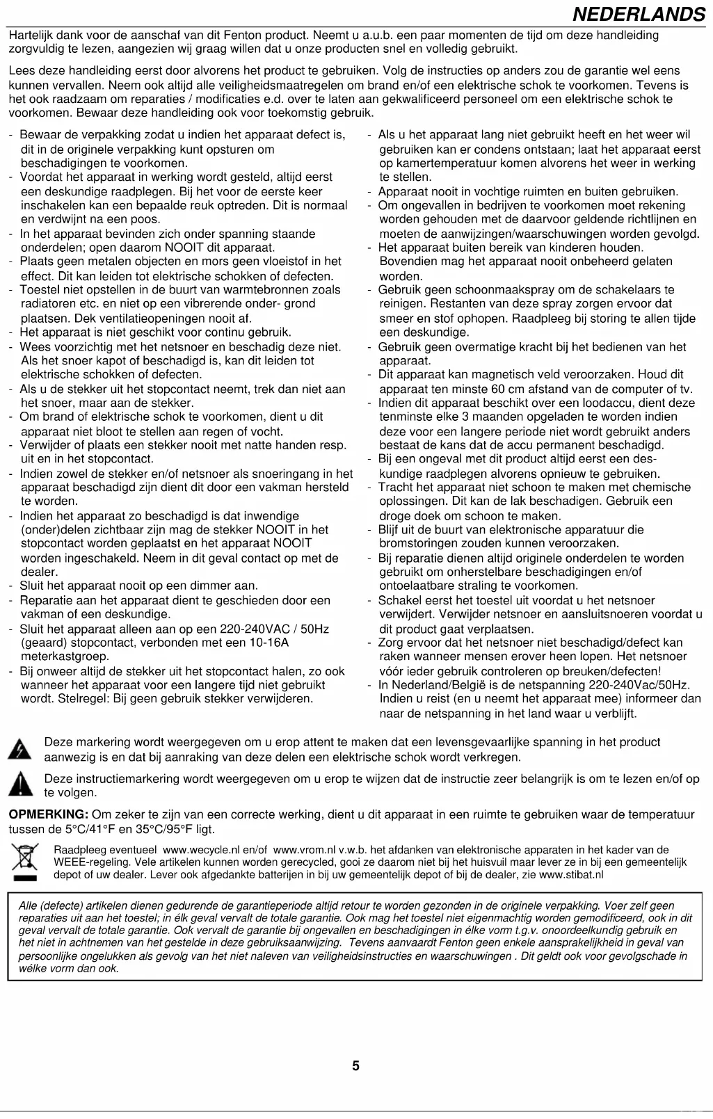 Deze markering wordt weergegeven om u erop attent te maken dat een levensgevaarlijke spanning in het product aanwezig is en dat bij aanraking van deze delen een elektrische schok wordt verkregen. Deze instructiemarkering wordt weergegeven om u erop te wijzen dat de instructie zeer belangrijk is om te lezen en/of op te volgen. OPMERKING: Om zeker te zijn van een correcte werking, dient u dit apparaat in een ruimte te gebruiken waar de temperatuur tussen de 5°C/41°F en 35°C/95°F ligt. Raadpleeg eventueel www.wecycle.nl en/of www.vrom.nl v.w.b. het afdanken van elektronische apparaten in het kader van de WEEE-regeling. Vele artikelen kunnen worden gerecycled, gooi ze daarom niet bij het huisvuil maar lever ze in bij een gemeentelijk depot of uw dealer. Lever ook afgedankte batterijen in bij uw gemeentelijk depot of bij de dealer, zie www.stibat.nl