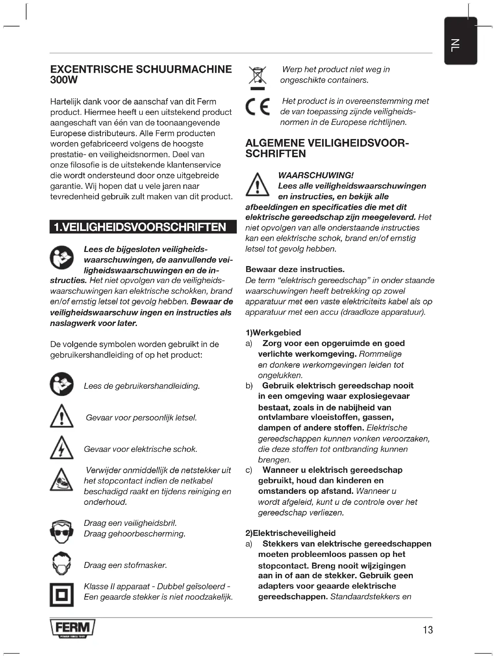 EXCENTRISCHE SCHUURMACHINE 300W Hartelijk dank voor de aanschaf van dit Ferm product. Hiermee heeft u een uitstekend product aangeschaft van één van de toonaangevende Europese distributeurs. Alle Ferm producten worden gefabriceerd volgens de hoogste prestatie- en veiligheidsnormen. Deel van onze filosofie is de uitstekende klantenservice die wordt ondersteund door onze uitgebreide garantie. Wij hopen dat u vele jaren naar tevredenheid gebruik zult maken van dit product.