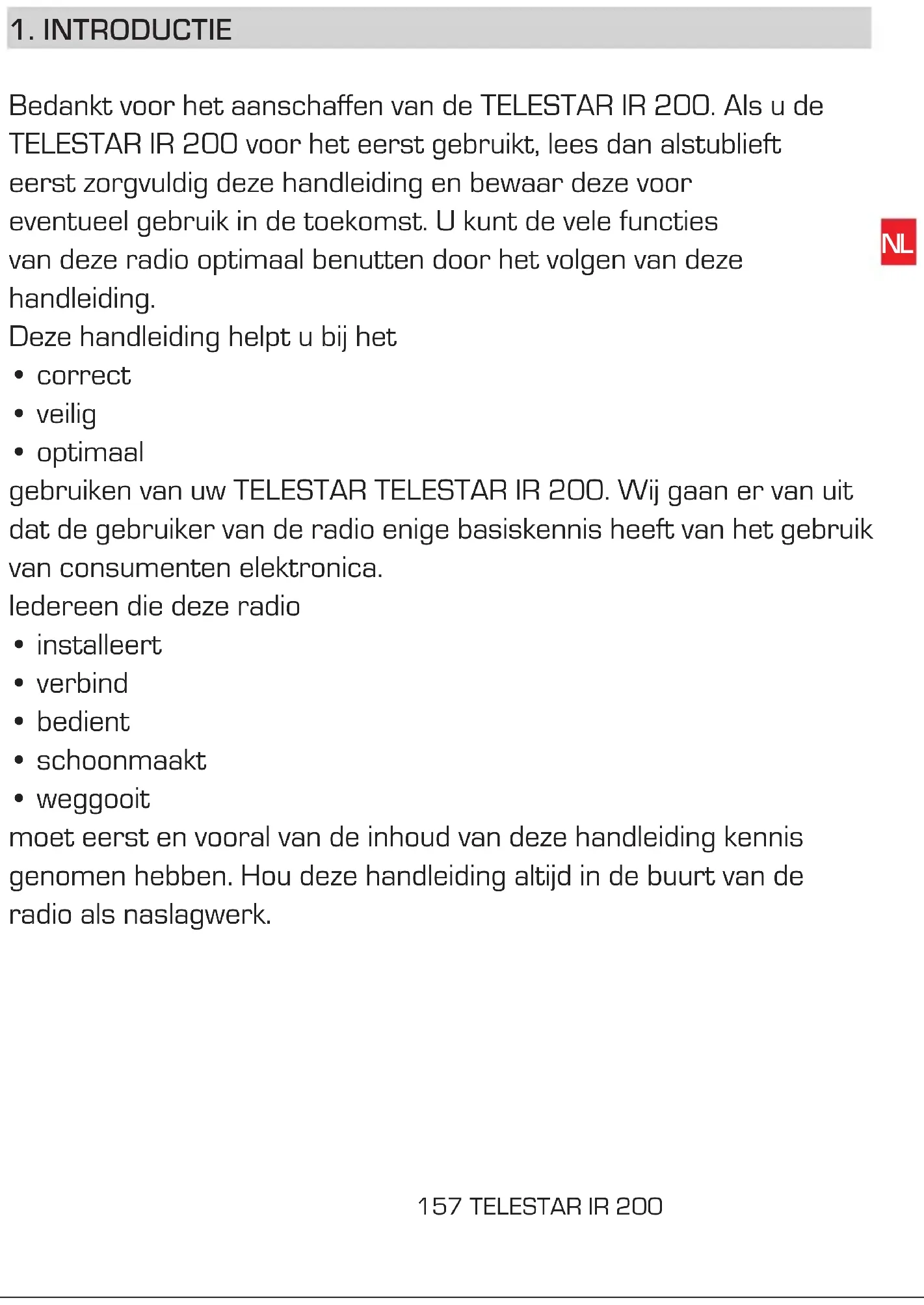 - optimaal gebruiken van uw TELESTAR TELESTAR IR 200. Wij gaan er van uit dat de gebruiker van de radio enige basiskennis heeft van het gebruik van consumenten elektronica. Iedereen die deze radio
