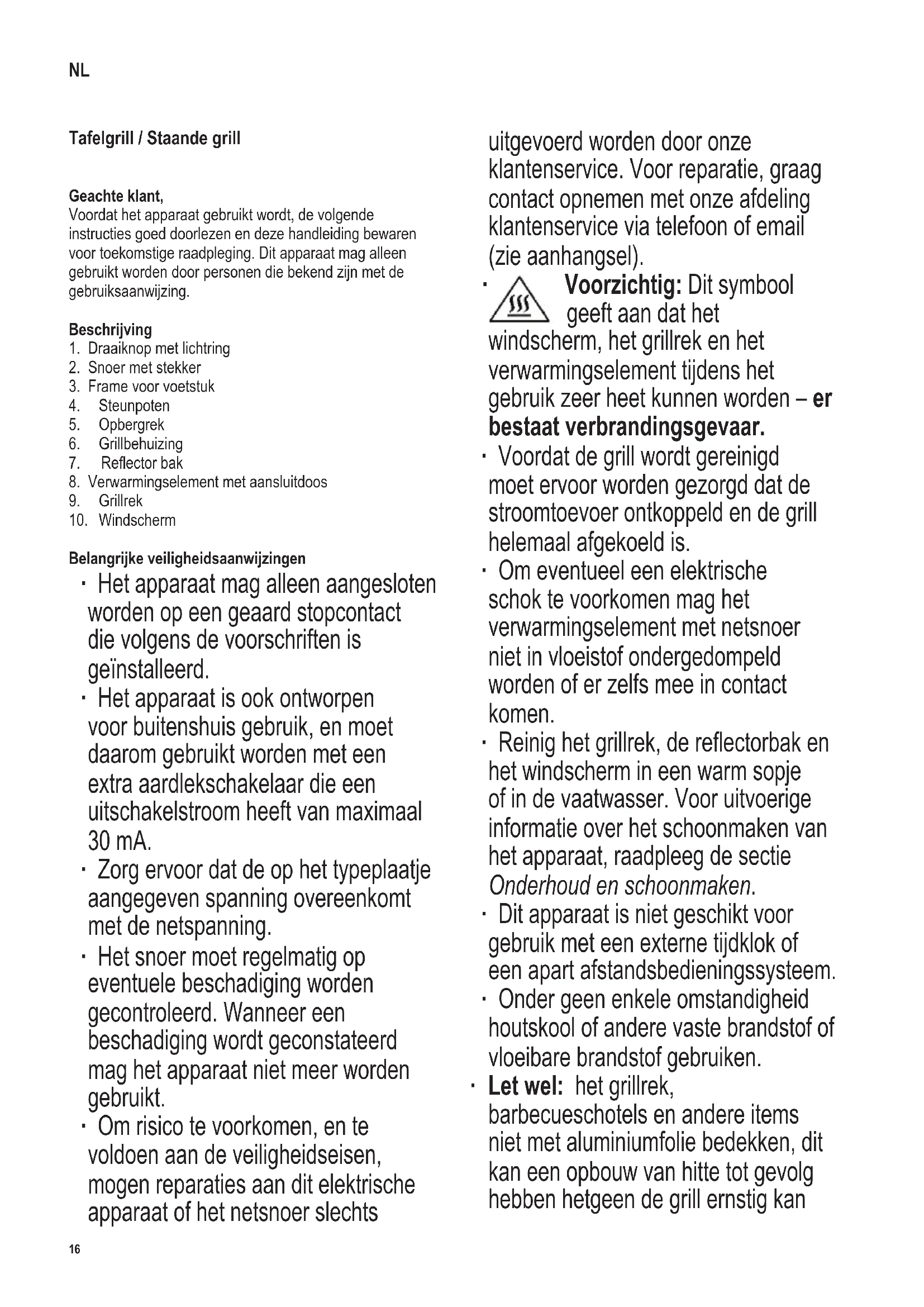 Voorzichtig: Dit symbool geeft aan dat het windscherm, het grillrek en het verwarmingselement tijdens het gebruik zeer heet kunnen worden – er bestaat verbrandingsgevaar. ∙ Voordat de grill wordt gereinigd moet ervoor worden gezorgd dat de stroomtoevoer ontkoppeld en de grill helemaal afgekoeld is. ∙ Om eventueel een elektrische schok te voorkomen mag het verwarmingselement met netsnoer niet in vloeistof ondergedompeld worden of er zelfs mee in contact komen. ∙ Reinighetgrillrek,dereectorbaken het windscherm in een warm sopje of in de vaatwasser. Voor uitvoerige informatie over het schoonmaken van het apparaat, raadpleeg de sectie Onderhoud en schoonmaken. ∙ Dit apparaat is niet geschikt voor gebruik met een externe tijdklok of een apart afstandsbedieningssysteem. ∙ Onder geen enkele omstandigheid houtskool of andere vaste brandstof of vloeibare brandstof gebruiken. ∙ Let wel: het grillrek, barbecueschotels en andere items niet met aluminiumfolie bedekken, dit kan een opbouw van hitte tot gevolg hebben hetgeen de grill ernstig kan NL17 142 x 208 mm beschadigen. ∙ Er mag maximaal 900 ml water in de reectorbakgegotenworden. ∙ Dit apparaat is bestemd voor huishoudelijk of gelijkwaardig gebruik, zoals - in bedrijfskeukens, in winkels, kantoren of andere bedrijfsruimtes, - in agrarische instellingen, - door klanten in hotels, motels enz. en gelijkwaardige accommodaties, - in bed-and-breakfast-gasthuizen. ∙ Dit apparaat mag gebruikt worden door kinderen (tenminste 8 jaar oud) en door personen met verminderde fysische, zintuigelijke of mentale bekwaanheden, of gebrek van ervaring en kennis, wanneer deze onder begeleiding zijn of instructies ontvangen hebben over het gebruik van dit apparaat en volledig de gevaren en veiligheidsvoorschriften begrijpen. ∙ Kinderen mogen niet met het apparaat spelen. ∙ Kinderen mogen in geen geval dit apparaat schoonmaken of onderhoudswerkzaamheden uitvoeren behalve wanneer onder toezicht van een volwassene en ze tenminste 8 jaar oud zijn. ∙ Het apparaat en het snoer moeten altijd goed weggehouden worden van kinderen jonger dan 8 jaar. ∙ Waarschuwing: Houd kinderen weg van inpakmateriaal, daar deze een bron van gevaar zijn b.v. door verstikking. ∙ Voordat het apparaat wordt gebruikt moet zowel de hoofdeenheid als gelijk welk hulpstuk, dat wordt aangebracht, eerst zorgvuldig op eventuele defecten worden gecontroleerd. Ingeval het apparaat, bijvoorbeeld, op een hard oppervlak is gevallen mag het niet meer worden gebruikt: zelfs onzichtbare beschadiging kan ongewenste effecten hebben op de gebruiksveiligheid van het apparaat. ∙ Tijdens gebruik moet de grill altijd op een hittebestendige ondergrond geplaatst zijn die tevens bestand is tegen spetteren en vlekken. Wanneer men voedsel grilt met een hoog vetgehalte kan spetteren niet altijd voorkomen worden. ∙ De grill niet bij een muur of in een hoek plaatsen, en zorg ervoor dat in de buurt ervan geen ontvlambare materialen worden opgeslagen. ∙ Vergeet niet dat voedsel met een hoog vet- of vochtgehalte de neiging heeft om te ontbranden; vul daarom vóór het gebruik altijd de reectorbak met water. De grill niet eerder op het netstroom aansluiten tot de reectorbak met water is gevuld. Het water helpt bij het afkoelen van de bak, vermindert de opbouw van rook, en vergemakkelijkt het schoonmaken. Het waterniveau in de gaten blijven houden. Water moet bijtijds worden bijgevuld, hierbij moet er echter goed op worden gelet dat het water niet met het verwarmingselement in aanraking komt. Voorzichtig: de grill eerst van de netspanning loskoppelen voordat er water toegevoegd wordt. ∙ Voordat de grill in gebruik wordt genomen altijd controleren of het verwarmingselement correct in de reectorbak en de huizing is aangebracht. ∙ De grill moet tijdens het gebruik steeds onder toezicht blijven. ∙ Houd er altijd rekening mee dat het verwarmingselement en het grillrek tijdens het gebruik erg heet worden. Zelfs nadat het verwarmingselement wordt uitgeschakeld, mag het niet worden aangeraakt totdat het voldoende is afgekoeld – anders bestaat het gevaar ernstige brandwonden op te lopen. ∙ Zorg dat het snoer niet in aanraking komt met hete delen van het apparaat. ∙ Haal de stekker uit het stopcontact - voordat men de reectorbak met water vult, - na ieder gebruik, - in geval van storing, - voor het schoonmaken.18 142 x 208 mm ∙ Het gebruik van een verlengsnoer of snoerhaspel veroorzaakt verlies van vermogen, mogelijk gecombineerd met een daaropvolgende warmte-opbouw in het snoer. Het is daarom noodzakelijk dat vóór het gebruik het snoer helemaal afgewikkeld wordt. Let erop dat het snoer goedgekeurd is voor buitenshuis gebruik envoorhetgespeciceerdvermogen(zietypeplaatje met waarde). ∙ Voorzichtig: De grill tijdens het gebruik niet verplaatsen. Voordat de grill wordt gedragen, getransporteerd, schoongemaakt of opgeborgen moet er goed op worden gelet dat hij voldoende is afgekoeld. Eventueel overgebleven water moet eruit worden gegoten. ∙ Let erop dat de grill niet buitenshuis wordt opgeborgen, of op enig andere plaats waar hij bloot kan staan aan extreme temperaturen of hoge vochtigheid. ∙ De fabrikant heeft geen verantwoordelijkheid wanneer dit apparaat verkeerd gebruikt wordt of wanneer de veiligheidsinstructies niet gevolgd worden. ∙ Dit product komt overeen met de richtlijnen aangegeven op het CE-label. Voordat het apparaat voor de eerste keer wordt gebruikt ∙ Alle verpakkingsmaterialen en stickers van het apparaat verwijderen. ∙ Hetgrillrek,dereectorbakenhetwindschermmeteen warm sopje schoonmaken; daarna goed afdrogen. ∙ Zet het apparaat in elkaar zoals beschreven wordt in Apparaat gereedmaken voor gebruik. ∙ Laat de grill ongeveer 10 minuten op vol vermogen en zonder etenswaren opwarmen (zie Grillen). Dit zal de geur verwijderen die normaal aanwezig is wanneer men de grill voor het eerst aanzet. Een kleine hoeveelheid rook kan afgegeven worden; men moet daarom zorgen voo