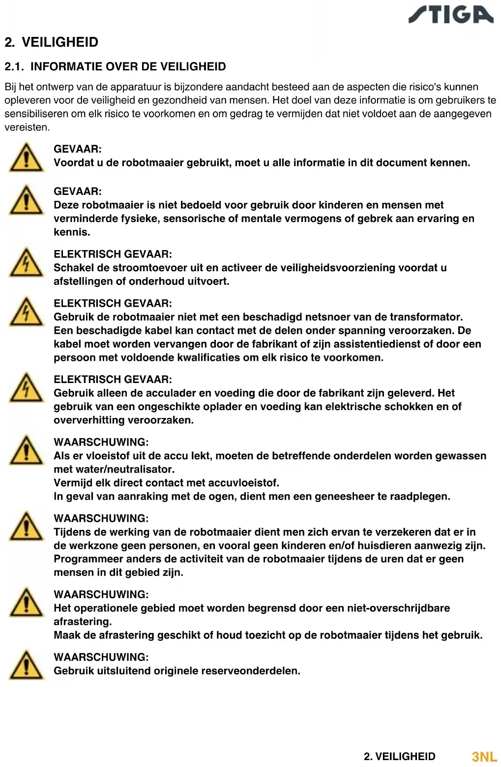 Bij het ontwerp van de apparatuur is bijzondere aandacht besteed aan de aspecten die risico's kunnen opleveren voor de veiligheid en gezondheid van mensen. Het doel van deze informatie is om gebruikers te sensibiliseren om elk risico te voorkomen en om gedrag te vermijden dat niet voldoet aan de aangegeven vereisten. GEVAAR: Voordat u de robotmaaier gebruikt, moet u alle informatie in dit document kennen. GEVAAR: Dezerobotmaaierisnietbedoeldvoorgebruikdoorkinderenenmensenmet verminderde fysieke, sensorische of mentale vermogens of gebrek aan ervaring en kennis. ELEKTRISCH GEVAAR: Schakeldestroomtoevoeruitenactiveerdeveiligheidsvoorzieningvoordatu afstellingen of onderhoud uitvoert. ELEKTRISCH GEVAAR: Gebruik de robotmaaier niet met een beschadigd netsnoer van de transformator. Eenbeschadigdekabelkancontactmetdedelenonderspanningveroorzaken.De kabelmoetwordenvervangendoordefabrikantofzijnassistentiedienstofdooreen persoonmetvoldoendekwalicatiesomelkrisicotevoorkomen. ELEKTRISCH GEVAAR: Gebruikalleendeacculaderenvoedingdiedoordefabrikantzijngeleverd.Het gebruik van een ongeschikte oplader en voeding kan elektrische schokken en of oververhittingveroorzaken. WAARSCHUWING: Alservloeistofuitdeacculekt,moetendebetreendeonderdelenwordengewassen metwater/neutralisator. Vermijd elk direct contact met accuvloeistof. In geval van aanraking met de ogen, dient men een geneesheer te raadplegen. WAARSCHUWING: Tijdensdewerkingvanderobotmaaierdientmenzichervanteverzekerendaterin dewerkzonegeenpersonen,envooralgeenkinderenen/ofhuisdierenaanwezigzijn. Programmeer anders de activiteit van de robotmaaier tijdens de uren dat er geen menseninditgebiedzijn. WAARSCHUWING: Het operationele gebied moet worden begrensd door een niet-overschrijdbare afrastering. Maakdeafrasteringgeschiktofhoudtoezichtopderobotmaaiertijdenshetgebruik. WAARSCHUWING: Gebruik uitsluitend originele reserveonderdelen.4 NL