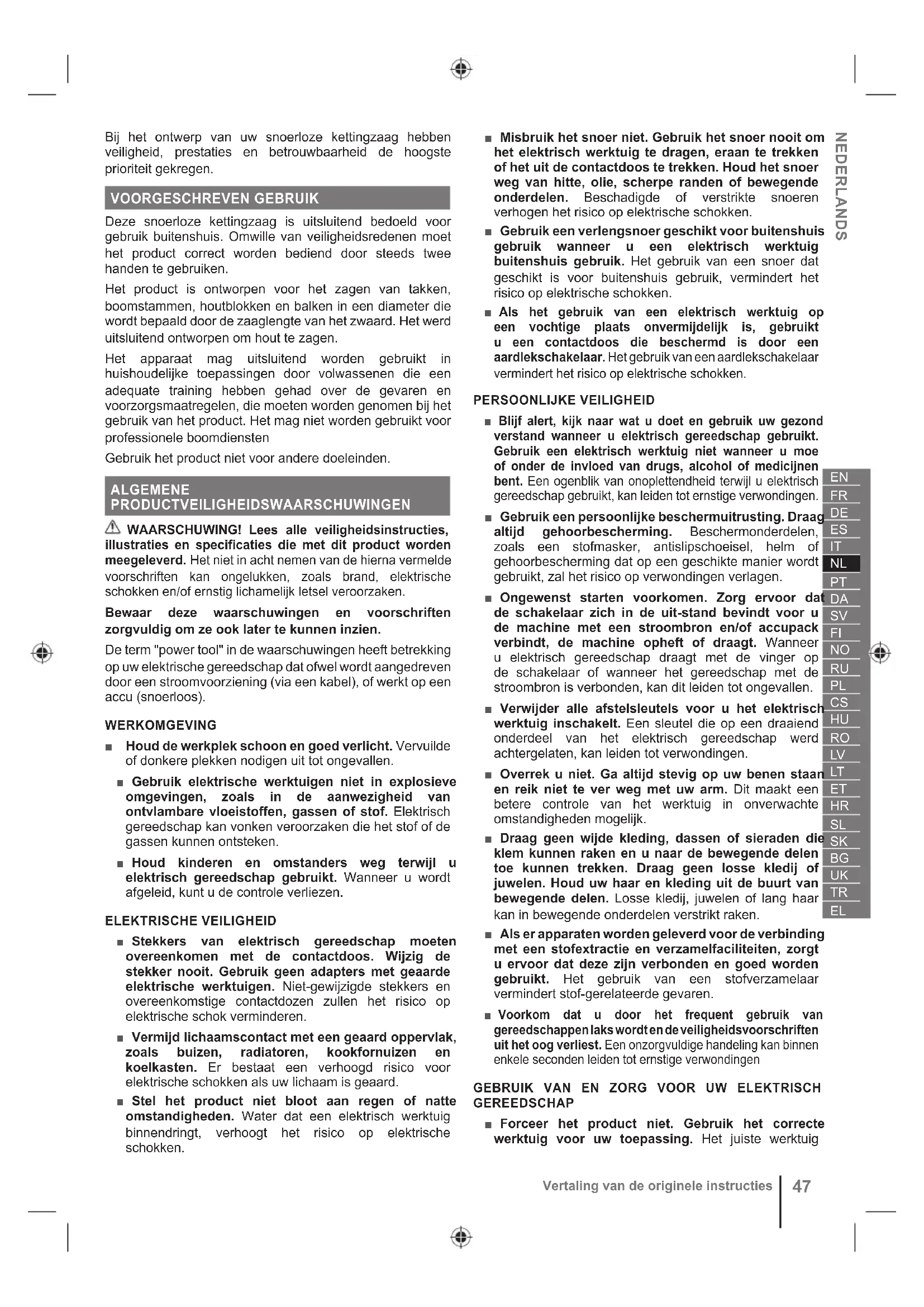 AANGEDREVEN WERKTUIG ■ Herlaad enkel met de oplader die door de fabrikant is gespecificeerd. Een oplader die voor een type accupack is geschikt kan een brandgevaar betekenen wanneer het met een ander accupack wordt gebruikt. ■ Gebruik elektrisch gereedschap uitsluitend met de specifiek toegewezen accupacks. Het gebruik van andere accupacks kan leiden tot risico's op letsels en brand. ■ Wanneer het accupack niet wordt gebruikt, moet u het weg houden van andere metalen objecten, zoals papierclips, munten, sleutels, spijkers, schroeven of andere kleine metalen voorwerpen die een verbinding kan maken van een terminal naar een andere. De batterijterminals kortsluiten kan leiden tot brandwonden of brand. ■ Bij verkeerd gebruik kan vloeistof uit de batterij lekken; vermijd contact. Als per ongeluk contact wordt gemaakt, spoel dan met water. Schakel bovendien medische hulp in als er vloeistof in de ogen komt. Vloeistof die uit de accu lekt, kan irritatie of brandwonden veroorzaken. ■ Gebruik geen beschadigde of gewijzigde accu of gereedschap. Beschadigde of gewijzigde accu's kunnen onvoorspelbaar gedrag vertonen en leiden tot brand, explosies, of het risico op letsel. ■ Stel accu's of gereedschap niet bloot aan vuur of hoge temperaturen. Blootstelling aan vuur of temperaturen hoger dan 130 °C kan explosies veroorzaken. ■ Volg alle instructies en laad de accu of het gereedschap niet op buiten het temperatuurbereik dat in de handleiding wordt aangegeven. Onjuist opladen of opladen bij temperaturen buiten het aangegeven bereik kan schade aan de accu veroorzaken en risico op brand verhogen. ONDERHOUD ■ Laat uw elektrisch gereedschap onderhouden door een gekwalificeerd onderhoudspersoon en gebruik hierbij uitsluitend identieke vervangonderdelen. Dit zal ervoor zorgen dat de veiligheid van het werktuig wordt behouden. ■ Beschadigde accu's mogen niet worden onderhouden. Onderhoud van accu's mag uitsluitend worden uitgevoerd door de fabrikant of erkende dienstverleners. ALGEMENE VEILIGHEIDSWAARSCHUWINGEN BIJ KETTINGZAGEN ■ Houd alle lichaamsdelen weg van de zaagketting terwijl de kettingzaag werkt. Voor u de kettingzaag start, zorgt u ervoor dat de zaagketting met niets in contact komt. Een korte onoplettendheid tijdens het werken met een kettingzaag kan ertoe leiden dat uw kledij of lichaam met de kettingzaag verstrikt raakt. ■ Houd de kettingzaag altijd vast met de rechterhand op het achterste handvat en de linkerhand op het voorste handvat. Als u de kettingzaag in een omgekeerde configuratie vasthoudt, wordt het risico op lichamelijke letsels groter. ■ Houd de kettingzaag enkel vast aan geïsoleerde grepen, omdat de kettingzaag contact kan maken met verborgen draden of haar eigen snoer. Snijbladen die in contact komen met een "stroomdraad" kunnen blootliggende metalen delen van de kettingzaag "onder stroom" zetten en de gebruiker een elektrische schok geven. ■ Draag oogbescherming. Beschermende uitrusting voor oren, hoofd, handen, benen en voeten wordt aanbevolen. Gepaste beschermende uitrusting zal persoonlijk letsel door rondvliegende brokstukken of toevallig contact met de ketting van de zaag verminderen. ■ Gebruik een kettingzaag niet in een boom, op een ladder, op een dak of op een andere onstabiele ondergrond. Gebruik van een kettingzaag op deze manier kan leiden tot ernstig persoonlijk letsel. ■ Zorg ervoor dat u altijd stevig vast staat en gebruik de kettingzaag alleen wanneer u op een vast, stabiel en effen oppervlak staat. Gladde of onstabiele oppervlakken kunnen leiden tot evenwichtsverlies of verlies van controle over de kettingzaag. ■ Wanneer u een tak onder spanning doorzaagt, pas dan op voor de terugslag. Wanneer de spanning in de houtvezels vrijkomt, kan de tak die onder spanning staat de gebruiker raken en/of ervoor zorgen dat hij de controle over de kettingzaag verliest.NEDERLANDS