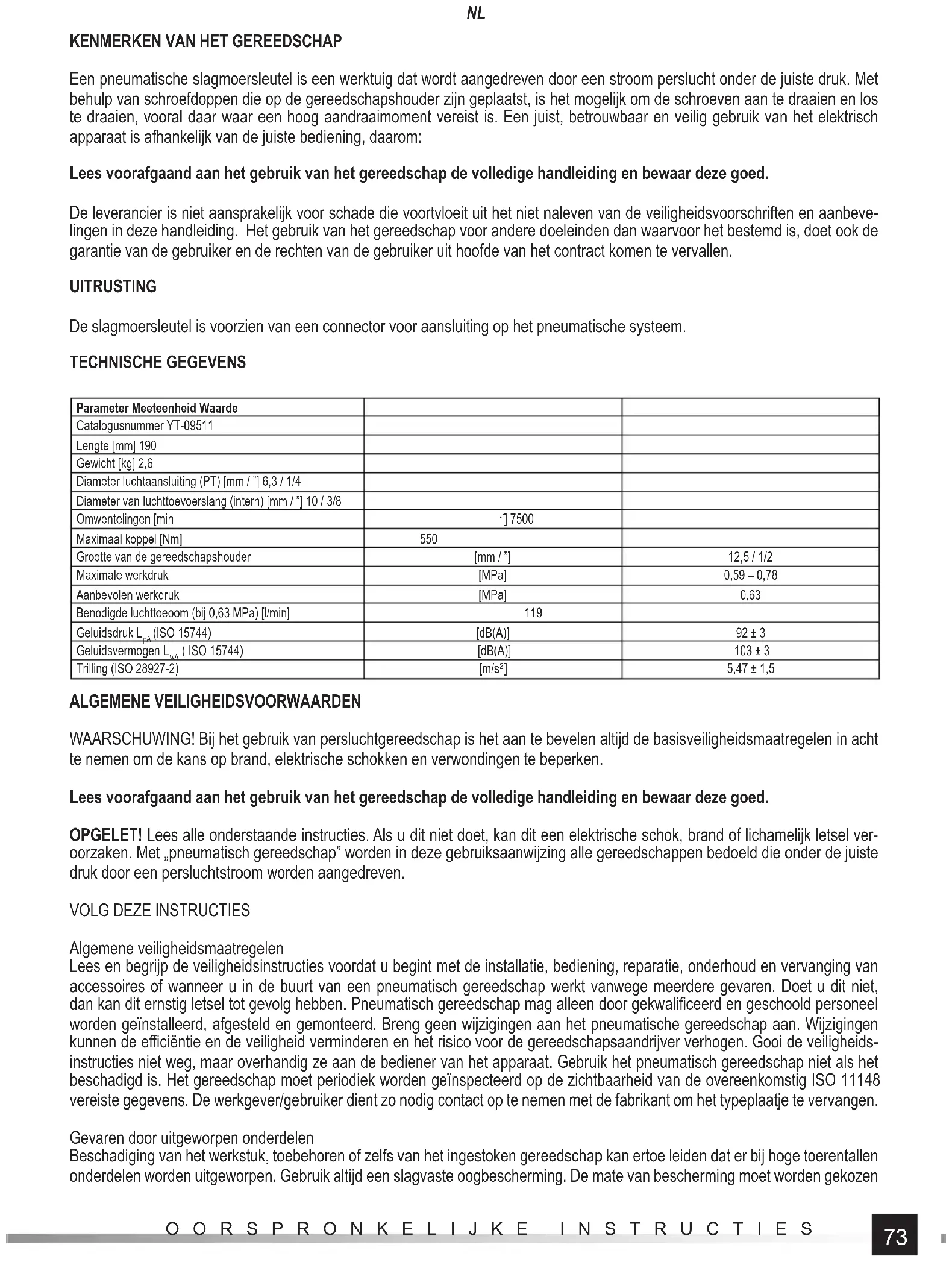 Een pneumatische slagmoersleutel is een werktuig dat wordt aangedreven door een stroom perslucht onder de juiste druk. Met behulp van schroefdoppen die op de gereedschapshouder zijn geplaatst, is het mogelijk om de schroeven aan te draaien en los te draaien, vooral daar waar een hoog aandraaimoment vereist is. Een juist, betrouwbaar en veilig gebruik van het elektrisch apparaat is afhankelijk van de juiste bediening, daarom: Lees voorafgaand aan het gebruik van het gereedschap de volledige handleiding en bewaar deze goed. De leverancier is niet aansprakelijk voor schade die voortvloeit uit het niet naleven van de veiligheidsvoorschriften en aanbeve- lingen in deze handleiding. Het gebruik van het gereedschap voor andere doeleinden dan waarvoor het bestemd is, doet ook de garantie van de gebruiker en de rechten van de gebruiker uit hoofde van het contract komen te vervallen. UITRUSTING De slagmoersleutel is voorzien van een connector voor aansluiting op het pneumatische systeem. TECHNISCHE GEGEVENS Parameter Meeteenheid Waarde Catalogusnummer YT-09511 Lengte [mm] 190 Gewicht [kg] 2,6 Diameter luchtaansluiting (PT) [mm / ”] 6,3 / 1/4 Diameter van luchttoevoerslang (intern) [mm / ”] 10 / 3/8 Omwentelingen [min