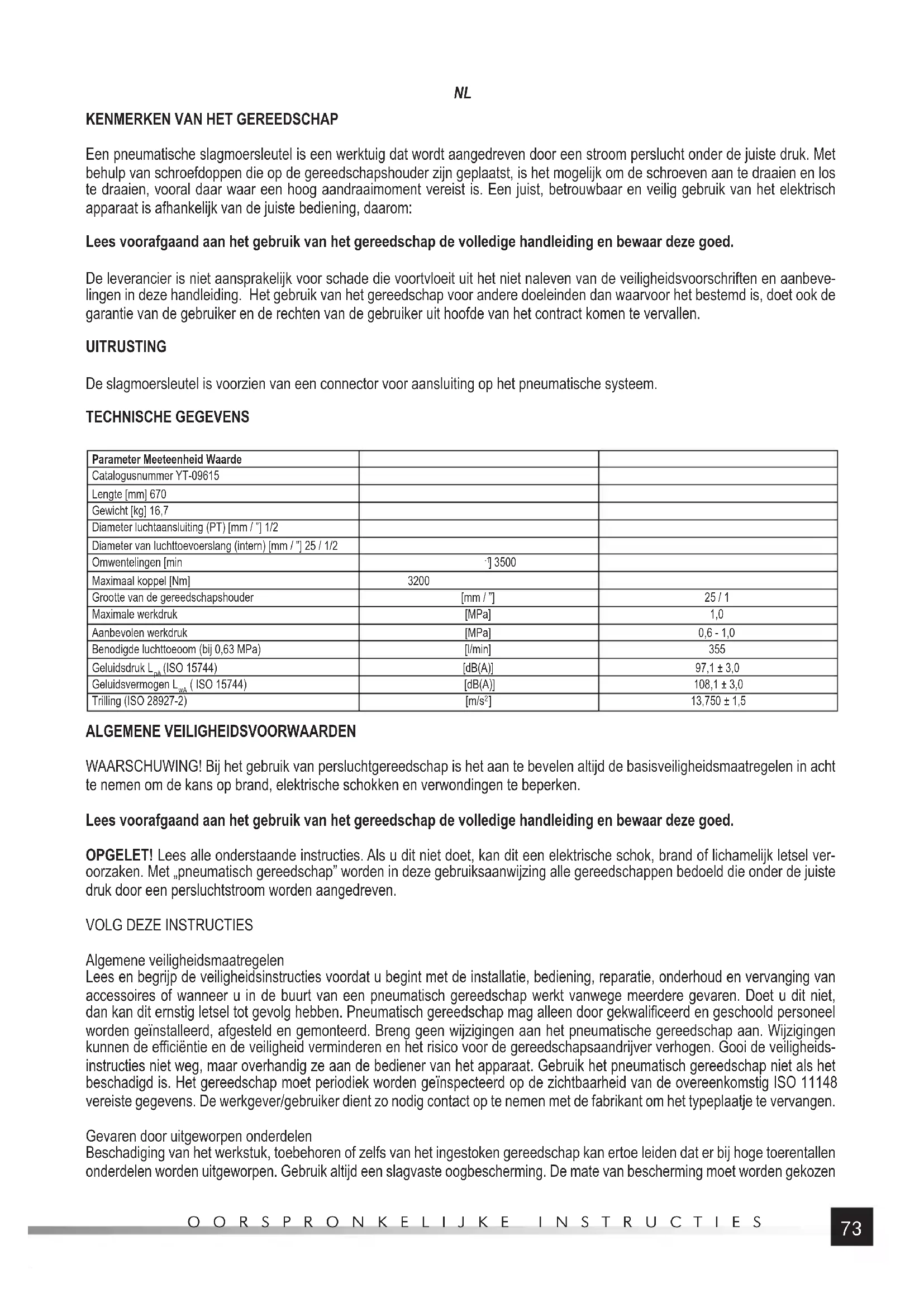Een pneumatische slagmoersleutel is een werktuig dat wordt aangedreven door een stroom perslucht onder de juiste druk. Met behulp van schroefdoppen die op de gereedschapshouder zijn geplaatst, is het mogelijk om de schroeven aan te draaien en los te draaien, vooral daar waar een hoog aandraaimoment vereist is. Een juist, betrouwbaar en veilig gebruik van het elektrisch apparaat is afhankelijk van de juiste bediening, daarom: Lees voorafgaand aan het gebruik van het gereedschap de volledige handleiding en bewaar deze goed. De leverancier is niet aansprakelijk voor schade die voortvloeit uit het niet naleven van de veiligheidsvoorschriften en aanbeve- lingen in deze handleiding. Het gebruik van het gereedschap voor andere doeleinden dan waarvoor het bestemd is, doet ook de garantie van de gebruiker en de rechten van de gebruiker uit hoofde van het contract komen te vervallen. UITRUSTING De slagmoersleutel is voorzien van een connector voor aansluiting op het pneumatische systeem. TECHNISCHE GEGEVENS Parameter Meeteenheid Waarde Catalogusnummer YT-09615 Lengte [mm] 670 Gewicht [kg] 16,7 Diameter luchtaansluiting (PT) [mm / ”] 1/2 Diameter van luchttoevoerslang (intern) [mm / ”] 25 / 1/2 Omwentelingen [min